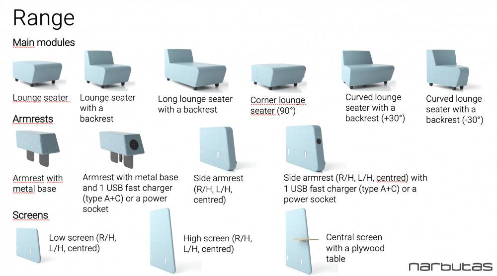 Sohvassa 1 syvä istuinmoduuli selkänojalla, 4 normaalia istuinmoduulia selkänojalla, 1 päädyn käsinojamoduuli sähköpistokkeella. Lisäksi istuimien välissä 1 pieni käsinojamoduuli, jossa USB-pistoke (A ja C).