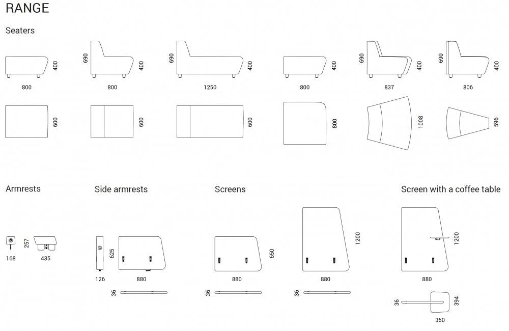 syvyys 80 cm (päädyn käsinojan kohdalta syv. 88 cm ja toisen päädyn moduuli syv. 125 cm)