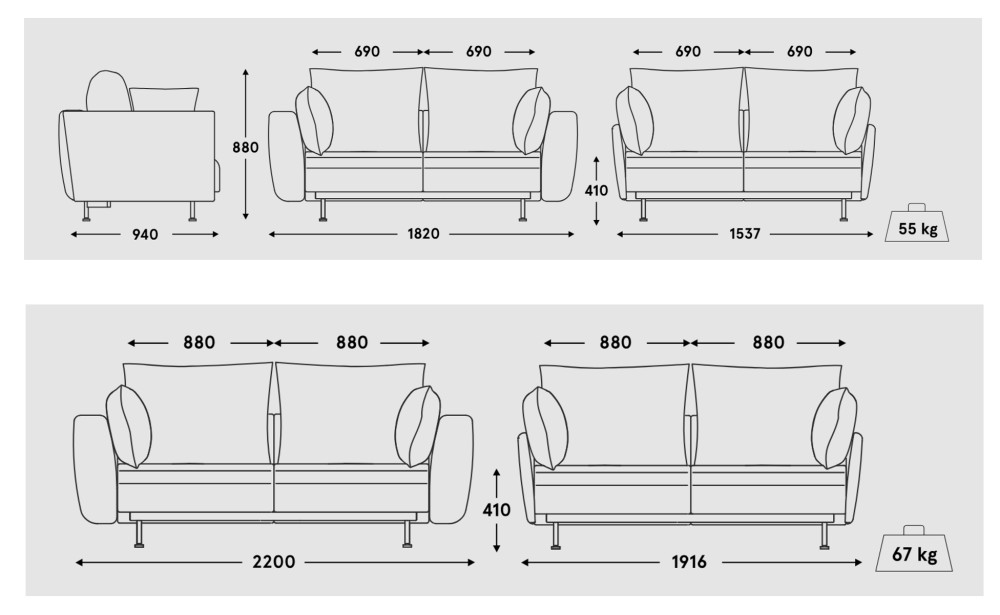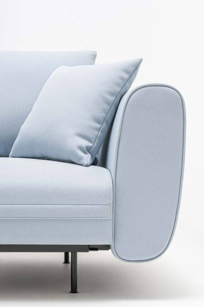 Selkänojassa käytetty silikonin ja leikattavan vaahtomuovin yhdistelmä tekee siitä muhkean ja kimmoisan. Selkänojan korkeus tarjoaa sekä hyvän selkätuen että mahdollisuuden nojata päätä mukavasti. Sohva on saatavilla kapeilla tai leveillä käsinojilla – kapeat säästävät tilaa, kun taas leveät tarjoavat pehmeän tukipinnan käsivarsille ja mahdollistavat mukavan sivuttaisen istuma-asennon.