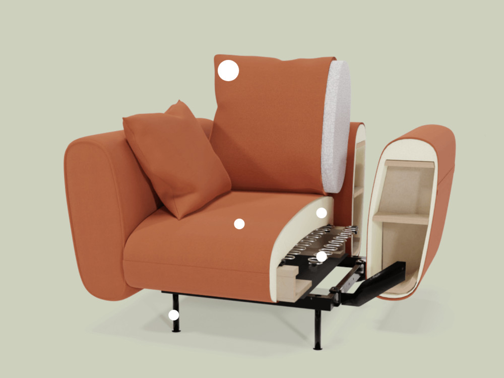 Selkänojatyyny: silikonitäyte + vaahtomuovi (50:50), verhoiltu