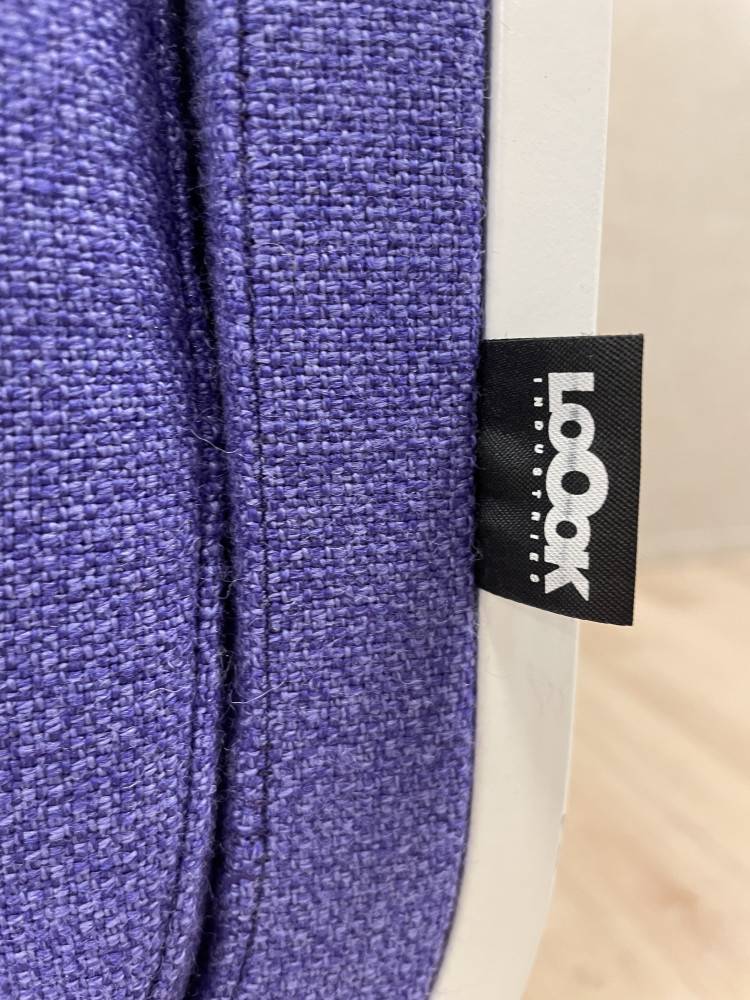 Taustaseinä verhoiltu samalla kankaalla, kuin istuinosa. Pyörivä jalusta.