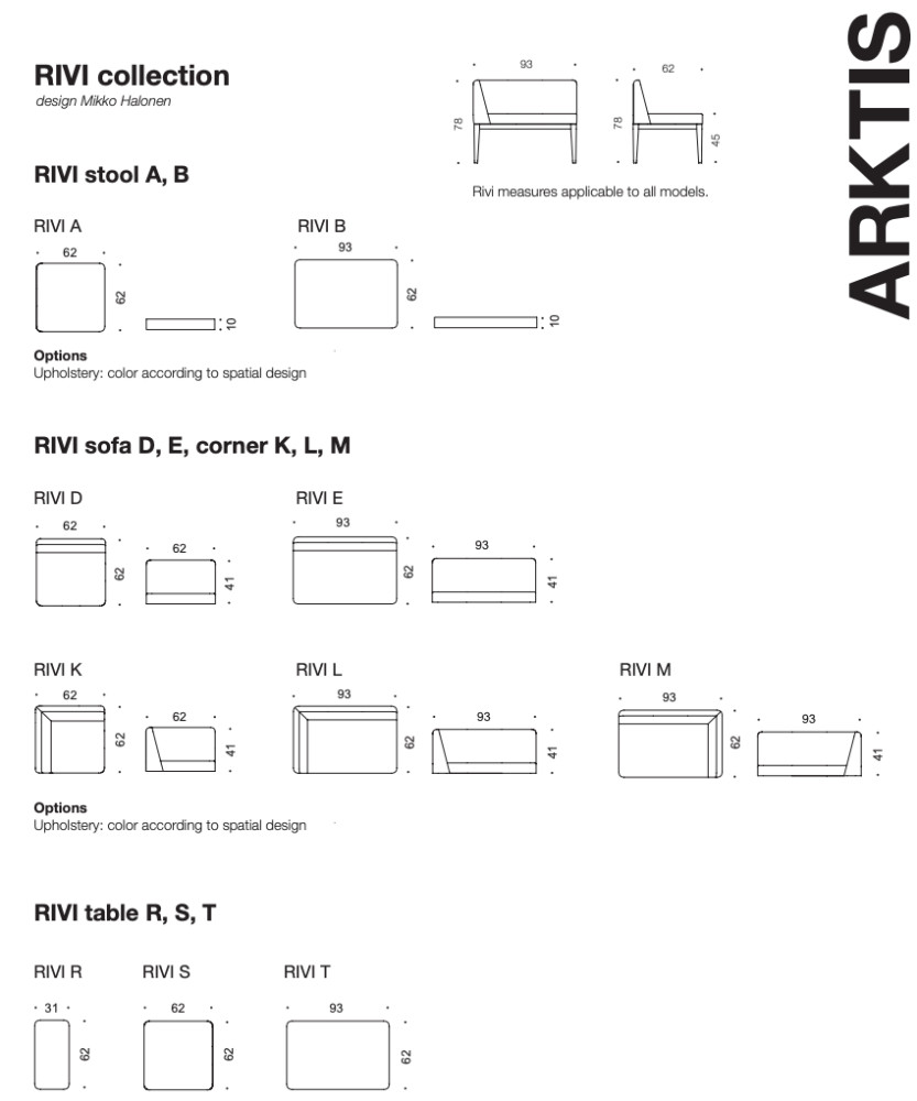 Rivi on Mikko Halosen suunnittelema moderni moduulisohvakokoelma, joka tarjoaa kevyen ja tilatehokkaan ratkaisun erilaisiin julkitiloihin. Kokoelma on suunniteltu yhdessä Vino-sarjan kanssa täydentämään Arktiksen skandinaavista kalustekokonaisuutta.