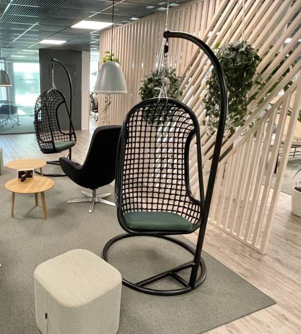 Tyylikäs ja moderni riipputuoli, jossa on tukeva metallinen jalusta ja ilmava verkkorakenne. Tämä tuoli tarjoaa rennon ja keinuvan istumakokemuksen, ja sopii täydellisesti lounge-tiloihin, toimistoihin, taukohuoneisiin, odotustiloihin tai kotiin. Minimalistinen musta runko ja vihreä istuinpehmuste tuovat tilaan modernia ilmettä.
