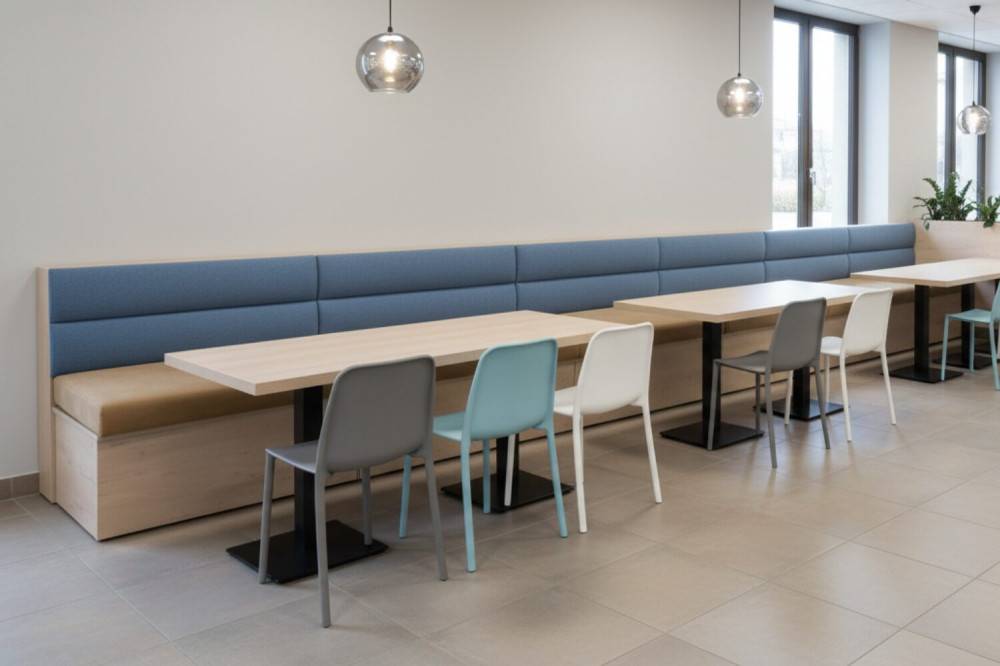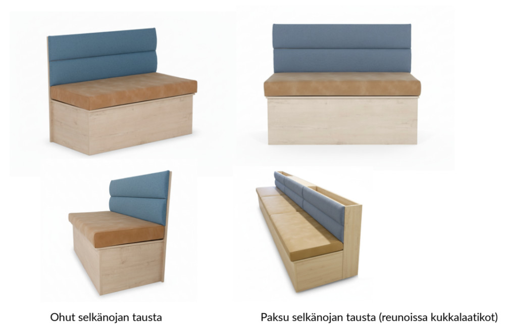 Laaja julkitiloihin soveltuva kangasvalikoima mahdollistaa kohteeseen sopivan ilmeen ja kulutuskestävyyden. Runkomateriaalina käytetään kulutuskestävää laminaattia, josta on saatavilla useita värisävyjä (esim. Formica Color -värit).