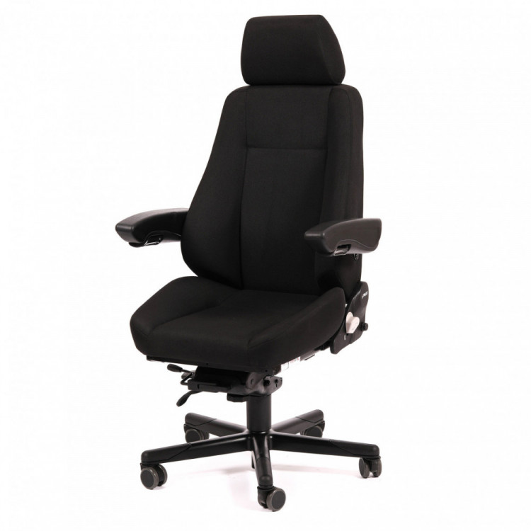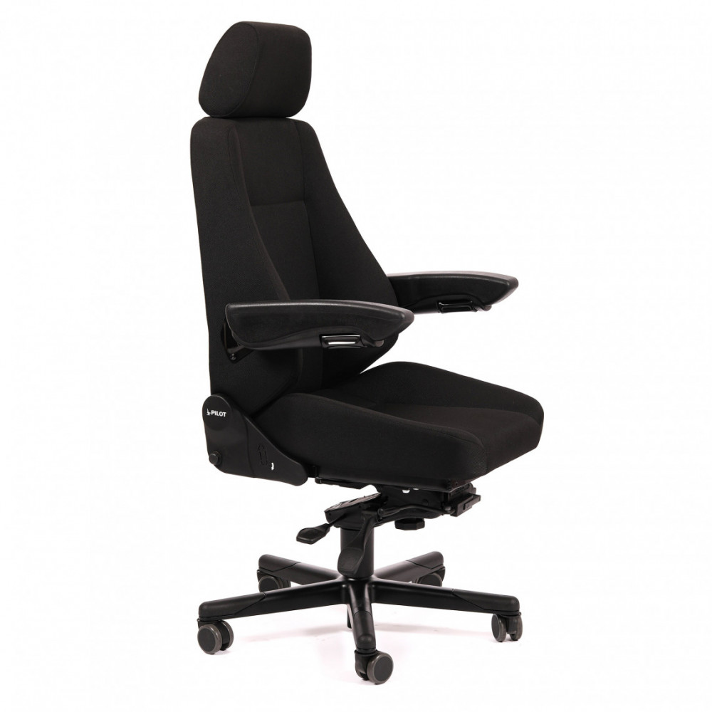 PILOT STANDARD tuolin mukana toimitetaan mukavat ja säädettävät vakio käsinojat, jotka voidaan asettaa eri kulmiin ylös ja alas. Tuolin mukana toimitetaan myös kankaalla päällystetty Standard-niskatuki, jossa on korkeuden- ja kallistuksensäätö. Tuolissa on musta kangasverhoilu.