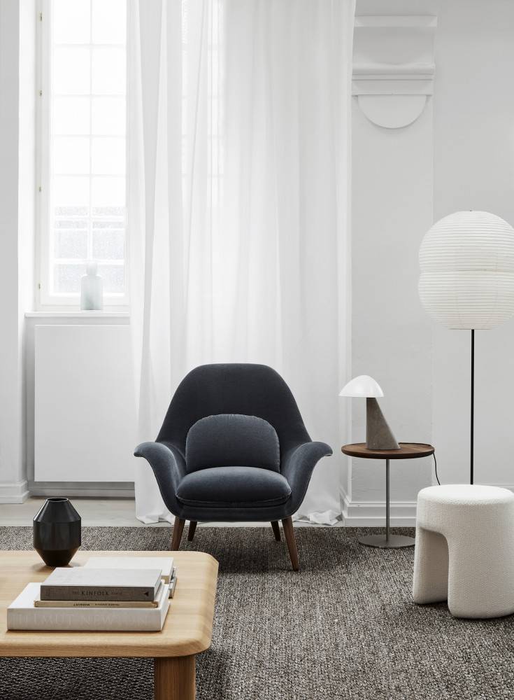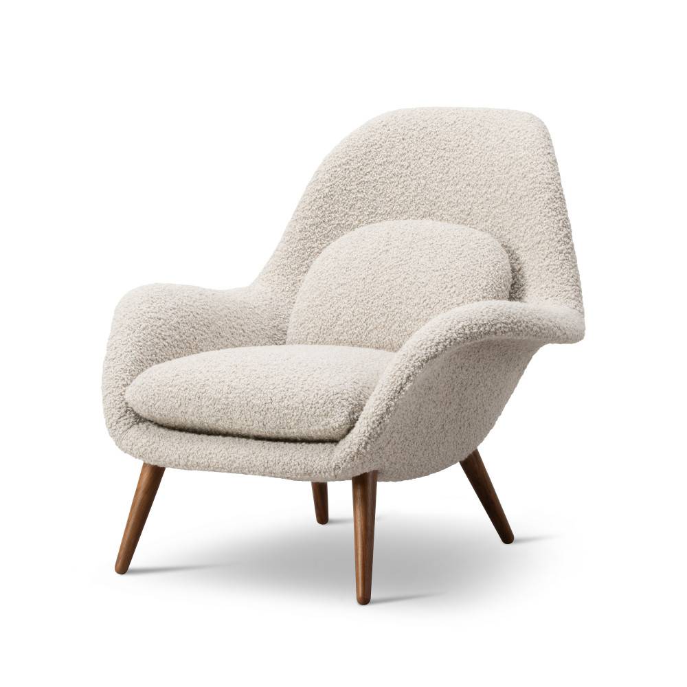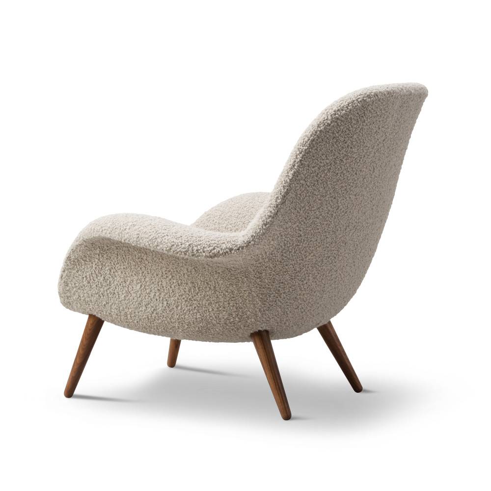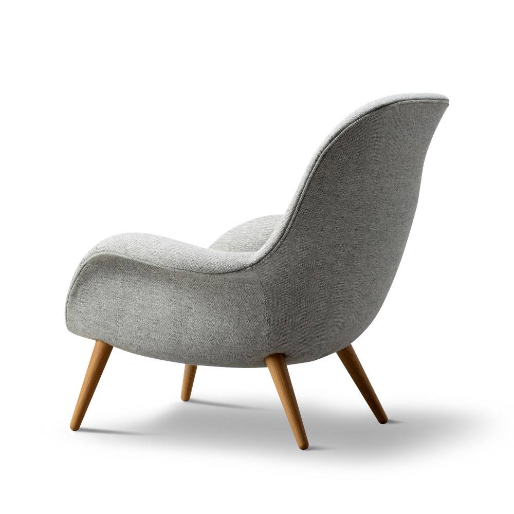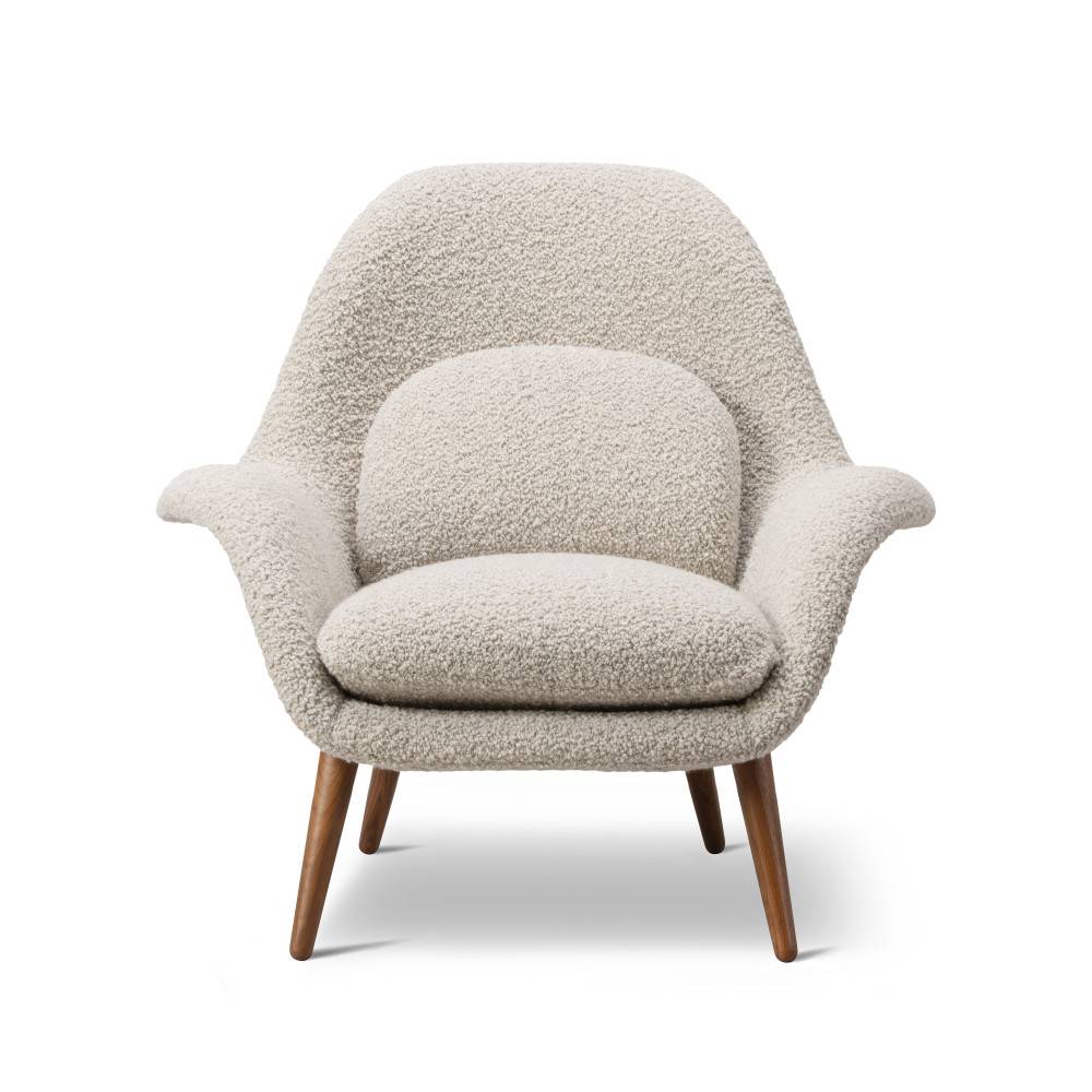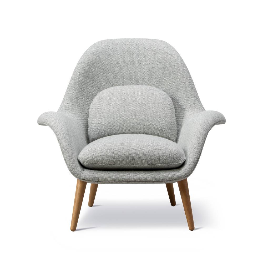 FREDERICIA SWOON LOUNGE on tyylikäs nojatuoli. Puujalat ovat saatavina neljässä eri värissä. Verhoiluvaihtoehtoja on useita.