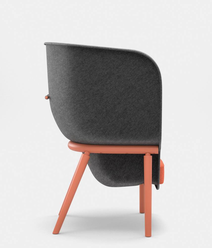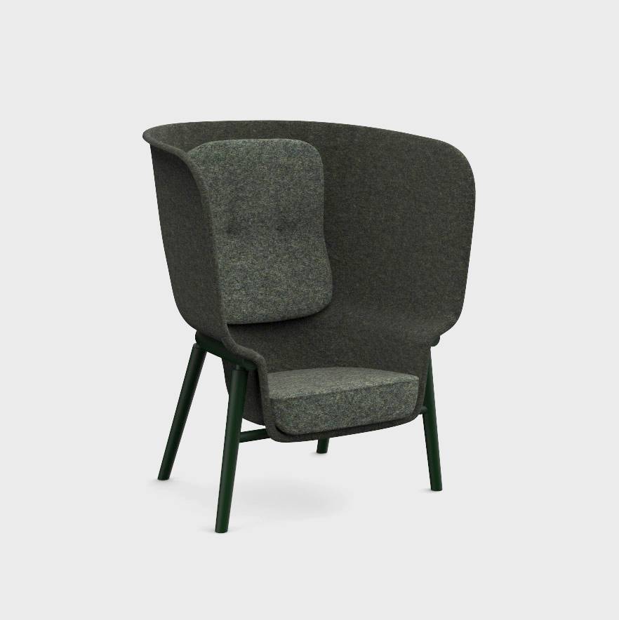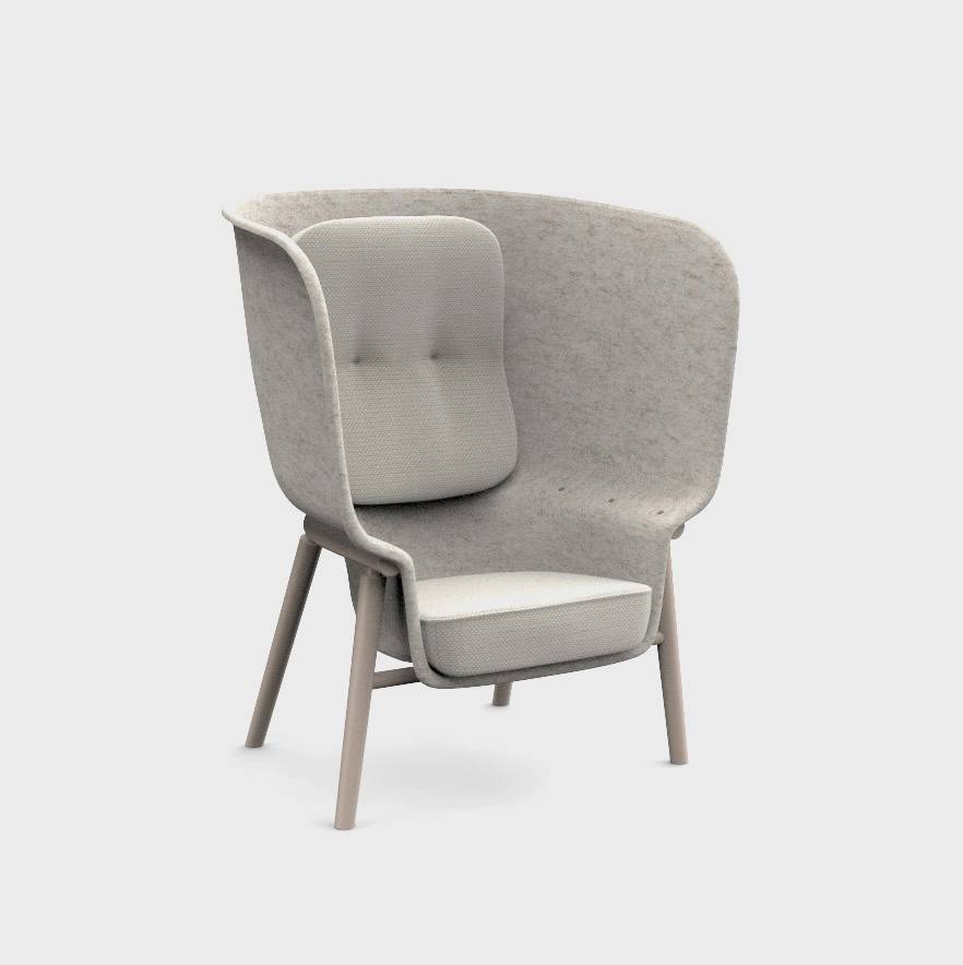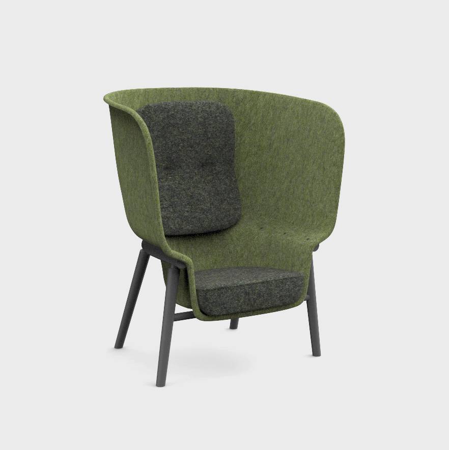 DEVORM POD on korkeaselkäinen, akustinen nojatuoli, jonka istuinkuppi on valmistettu PET-huovasta ja jalusta on massiivisaarnea. Tuolissa on lisäksi pehmustetut ja verhoillut kiinteät istuin- ja selkänojatyynyt. PET-huopa on pehmeä materiaali, joka on valmistettu täysin kierrätetyistä muovipulloista.