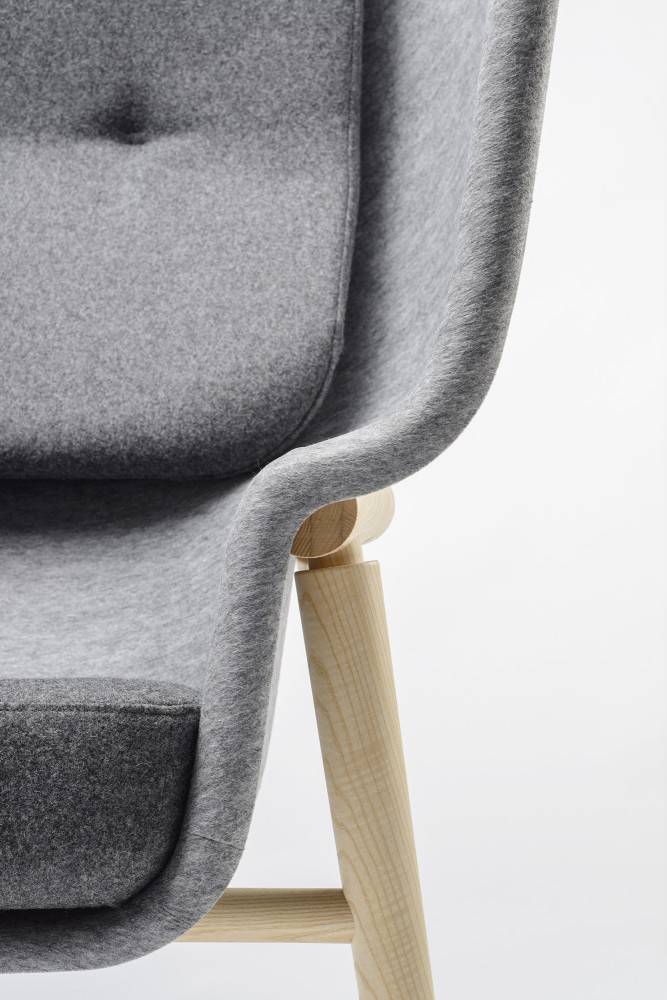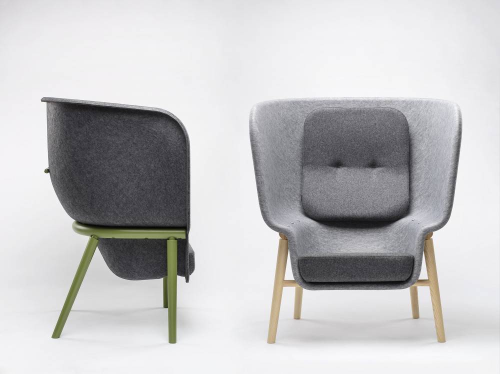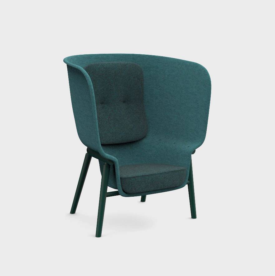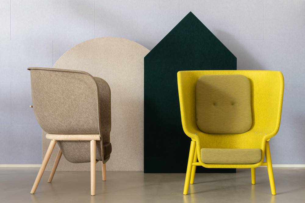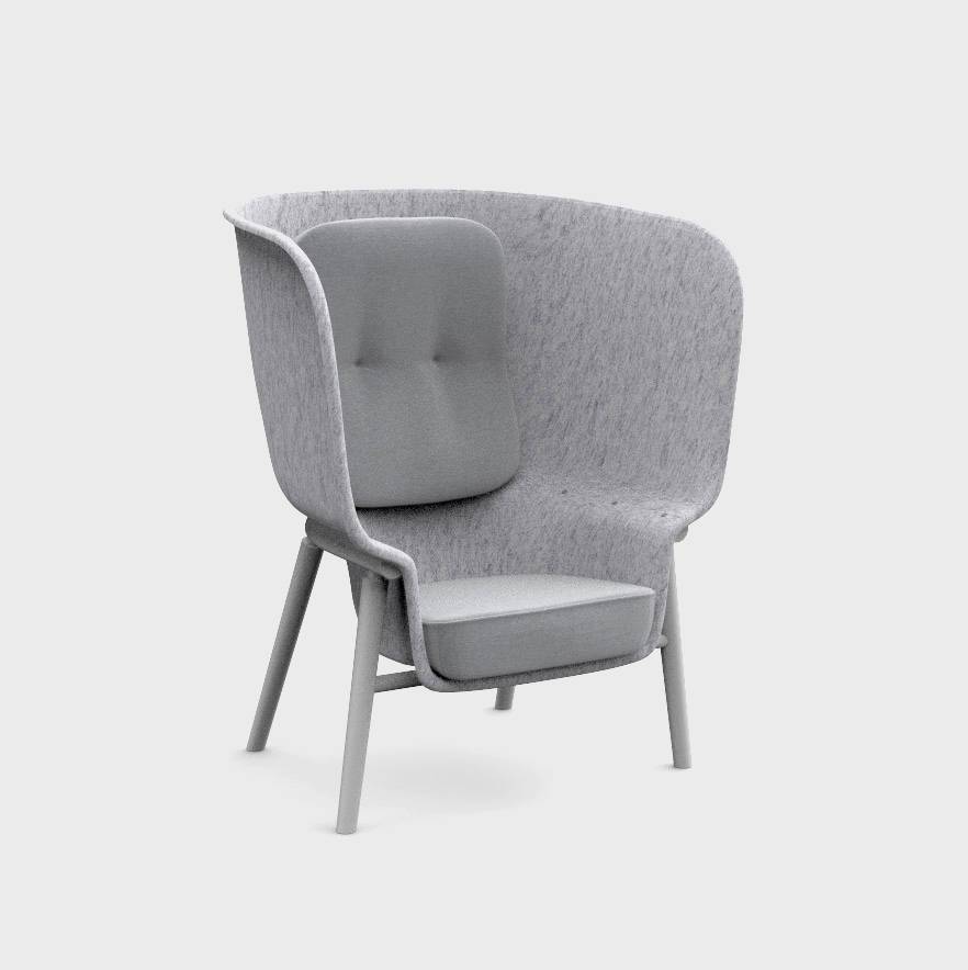 DEVORM POD on korkeaselkäinen, akustinen nojatuoli, jonka istuinkuppi on valmistettu PET-huovasta ja jalusta on massiivisaarnea. Tuolissa on lisäksi pehmustetut ja verhoillut kiinteät istuin- ja selkänojatyynyt. PET-huopa on pehmeä materiaali, joka on valmistettu täysin kierrätetyistä muovipulloista.