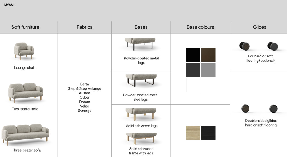 Tuoli on saatavilla useilla eri kangas- ja värivaihtoehdoilla. Jalustavaihtoehtoja on neljä, jolloin se sopii moneen eri sisustustyyliin. MYAMI-sarjaan kuuluu myös 2- ja 3-istuttavat sohvat, jotka tarjoavat saman poikkeuksellisen mukavuuden ja tyylikkyyden. Kokoelma on täydellinen valinta niin moderneihin kuin klassisiin tiloihin.
