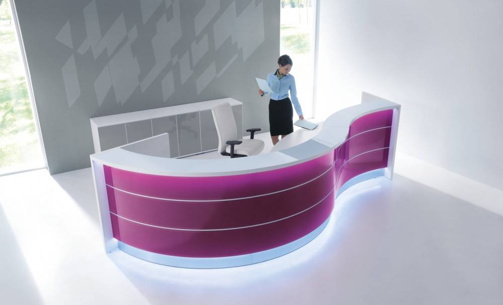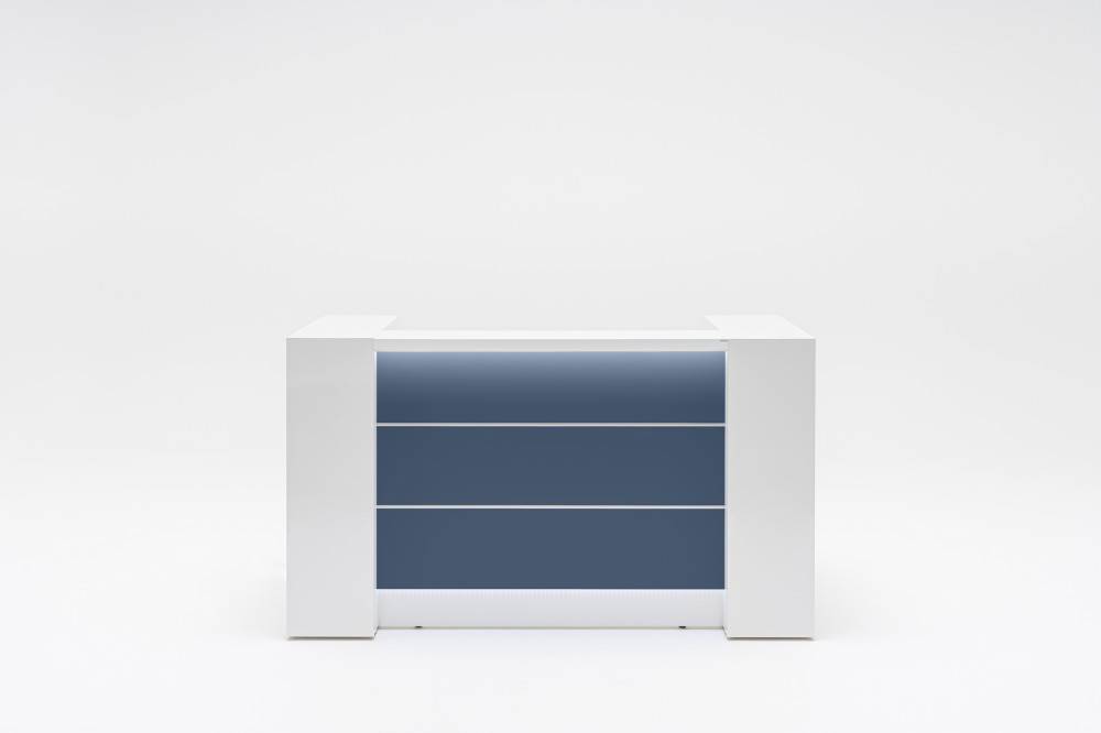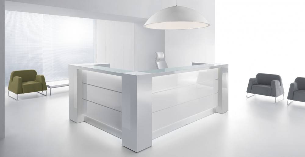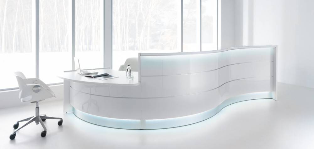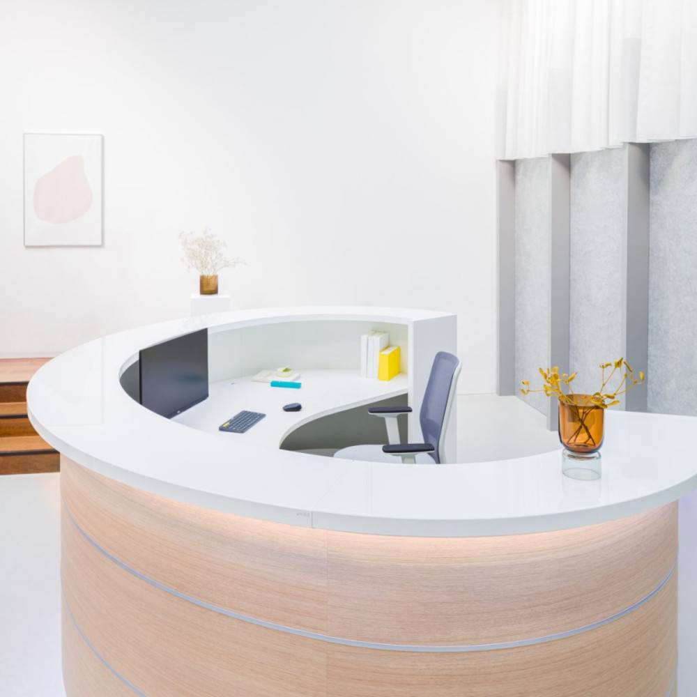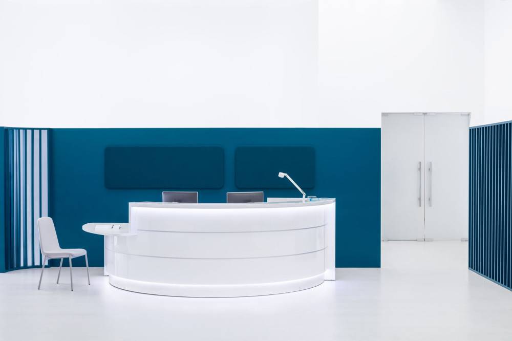 Valde-palvelutiski on suunniteltu vastaamaan modernin vastaanoton vaatimuksia. Sen dynaaminen muoto ja materiaalien yhdistelmä – lasi, alumiini ja korkeakiiltoiset laminaatit – luovat elegantin, mutta samalla hillityn kokonaisuuden. Kiiltävät valkoiset etusarjat viestivät selkeyttä ja siisteyttä, ja värivalinnalla voidaan myös korostaa yrityksen visuaalista identiteettiä. Vaakasuorat alumiinilistat tuovat muotoiluun liikettä ja korostavat tiskin modernia ilmettä.