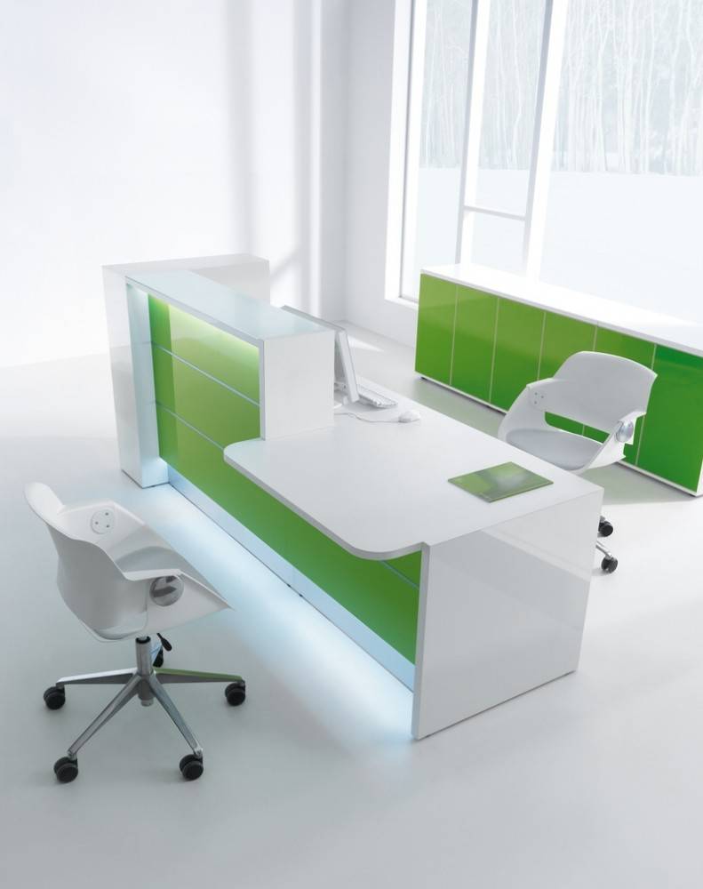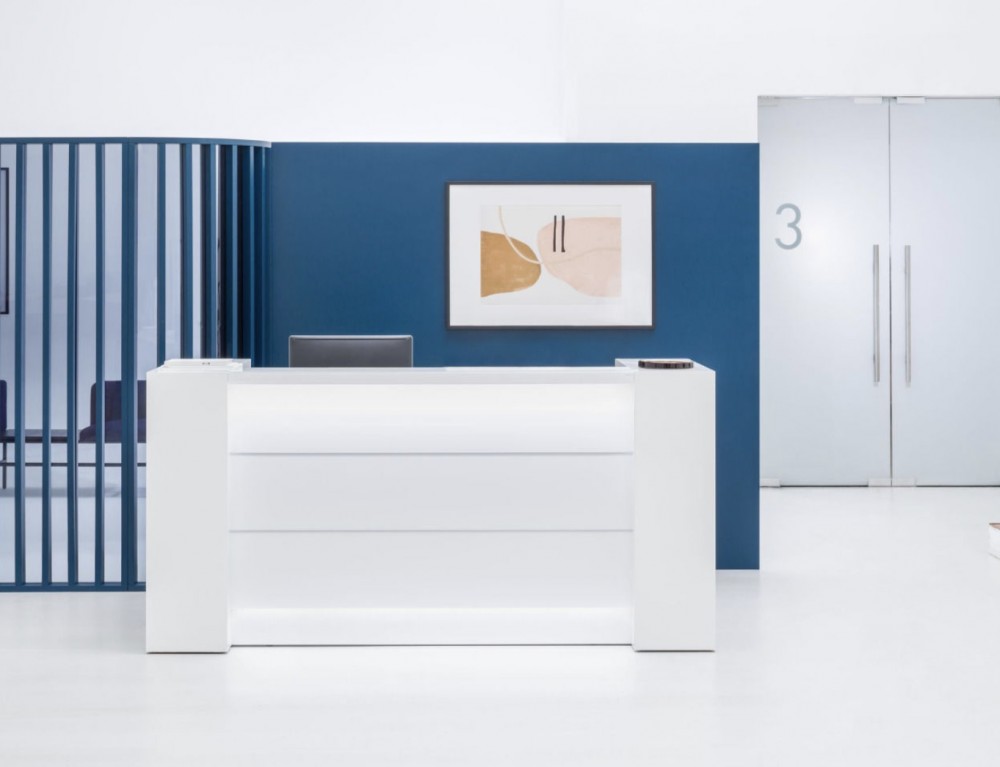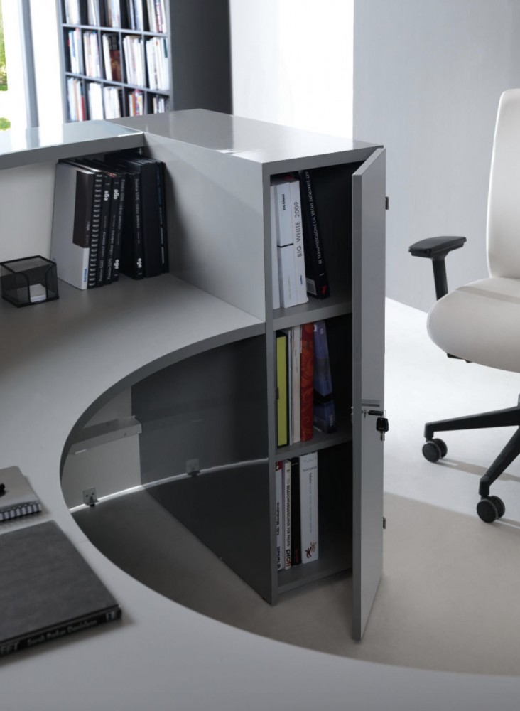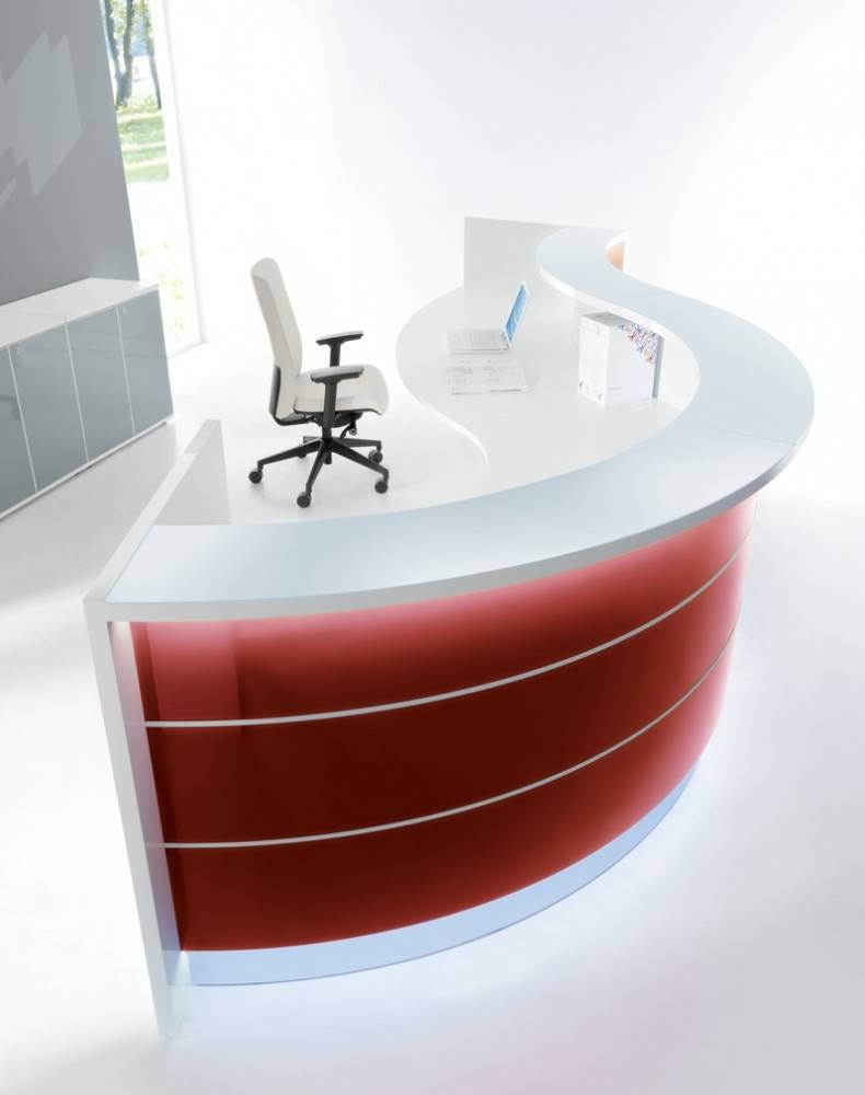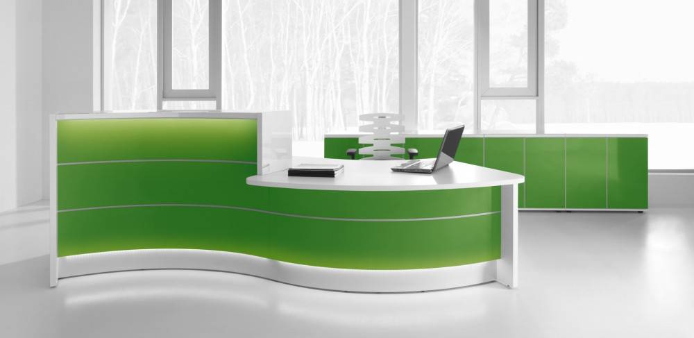 Valde-palvelutiski on suunniteltu vastaamaan modernin vastaanoton vaatimuksia. Sen dynaaminen muoto ja materiaalien yhdistelmä – lasi, alumiini ja korkeakiiltoiset laminaatit – luovat elegantin, mutta samalla hillityn kokonaisuuden. Kiiltävät valkoiset etusarjat viestivät selkeyttä ja siisteyttä, ja värivalinnalla voidaan myös korostaa yrityksen visuaalista identiteettiä. Vaakasuorat alumiinilistat tuovat muotoiluun liikettä ja korostavat tiskin modernia ilmettä.