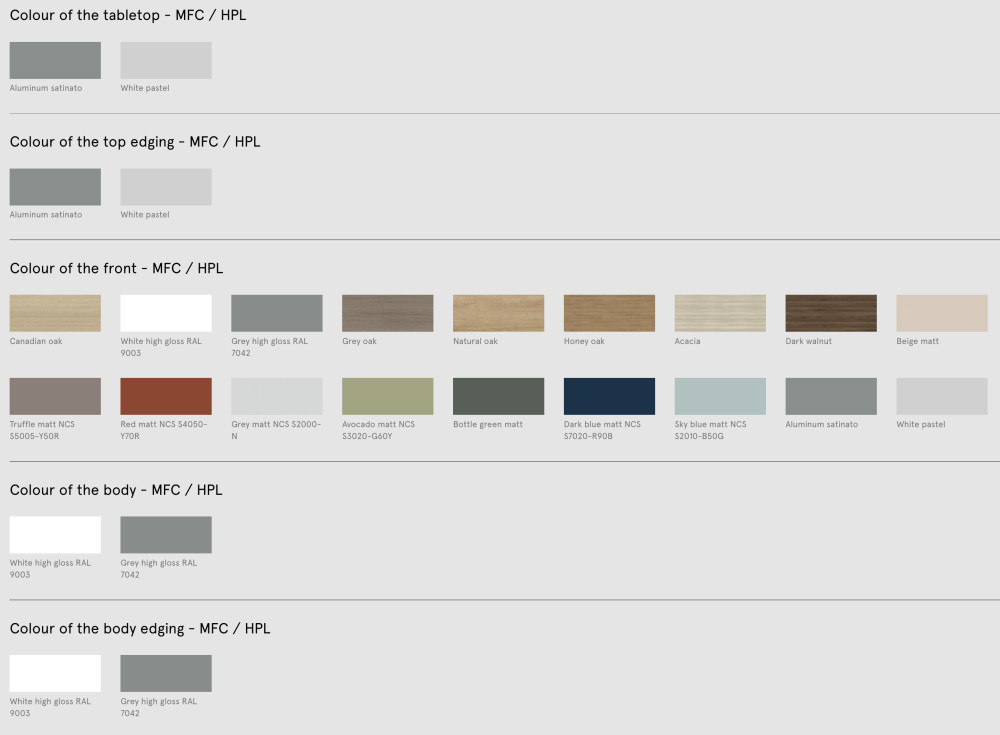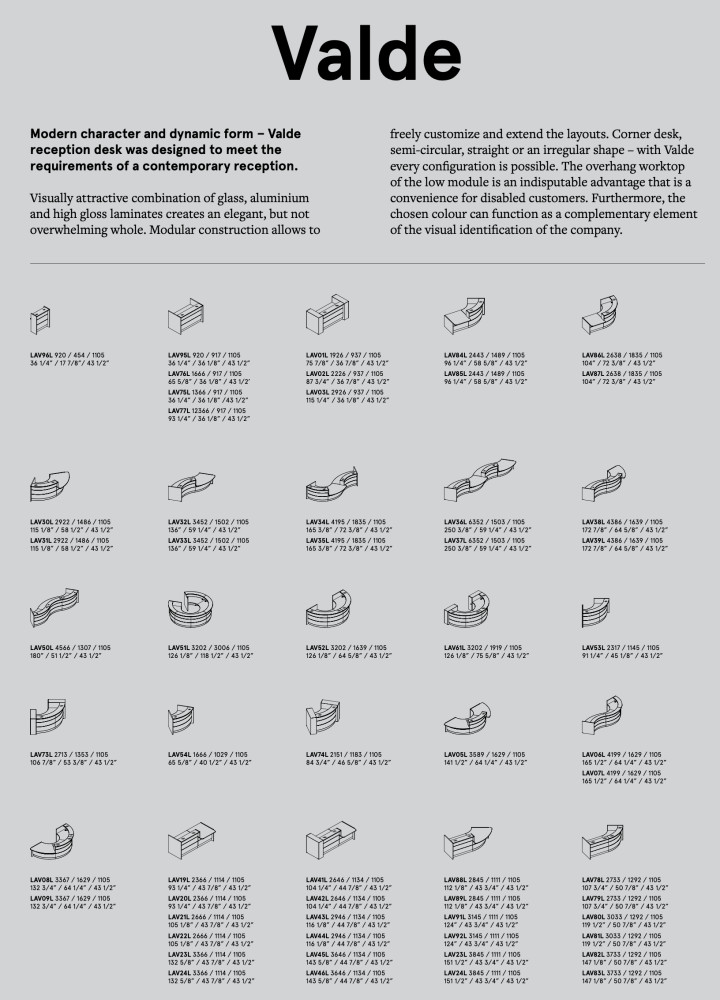 Modulaarisen rakenteen ansiosta Valde voidaan mukauttaa monenlaisiin tiloihin. Mahdollisia kokoonpanoja ovat suora, kulmamallinen, puolipyöreä tai epäsäännöllinen muoto. Esteettömyyttä tukee madallettu moduuli, jonka ulkoneva pöytätaso helpottaa asiointia pyörätuolilla. Näin Valde tarjoaa sekä näyttävän että käytännöllisen ratkaisun nykyaikaisiin vastaanottotiloihin.
