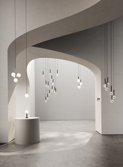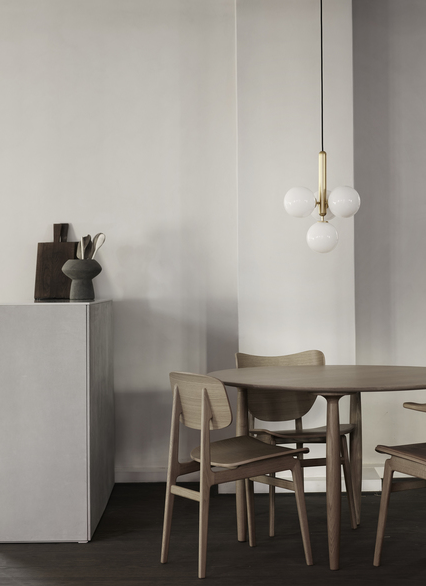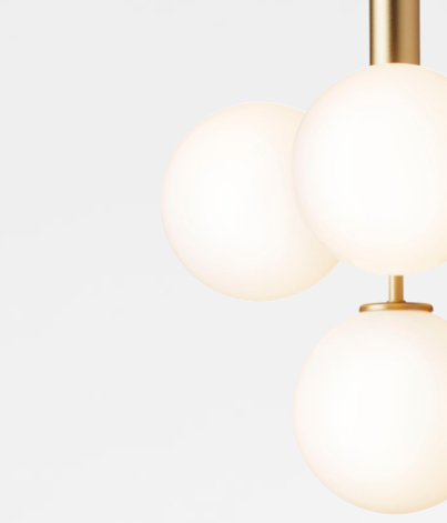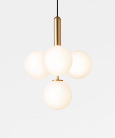 NUURA MIIRA 4 riippuvalaisimessa on 4kpl:ta käsityönä valmistettuja opalinvalkoista lasipalloja yhdistettynä messinginväriseen kattokupuun ja yksityiskohtiin.