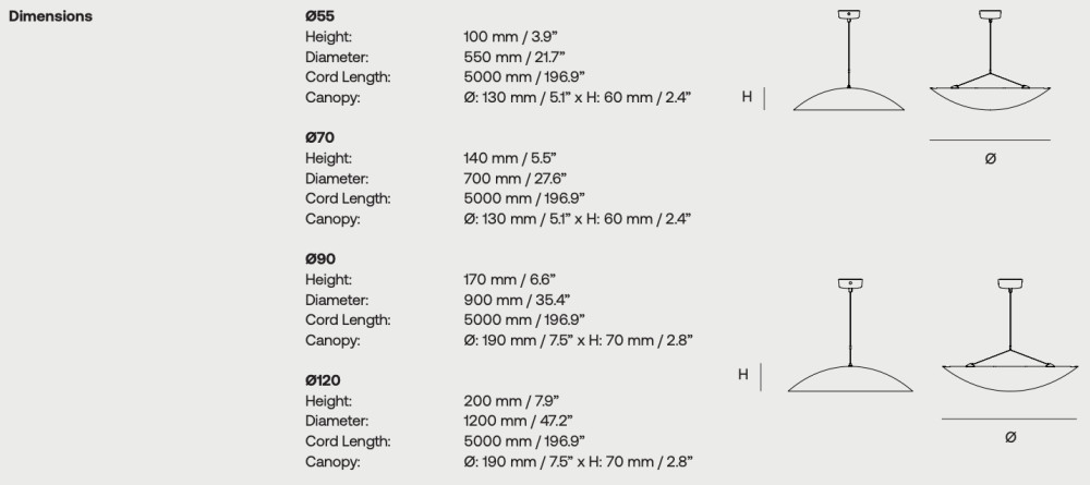 Tense-sarjaan kuuluu neljä riippuvalaisinta eri kokoisina (Ø55, Ø70, Ø90 ja Ø120 cm) sekä näyttävä Tense Chandelier Ø55 cm, jossa kolme varjostinta muodostaa dynaamisen kokonaisuuden.
