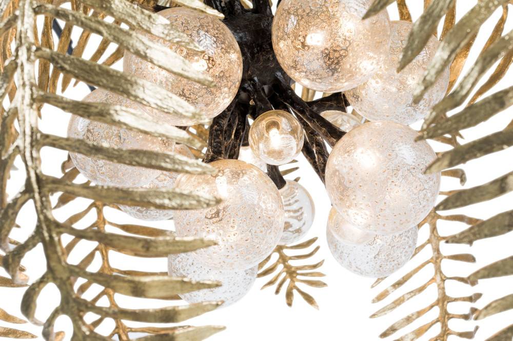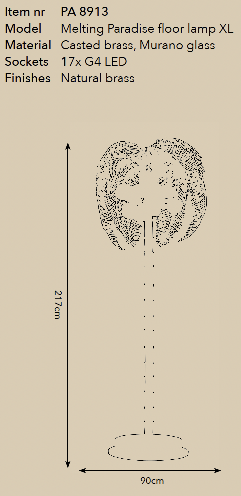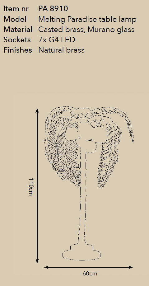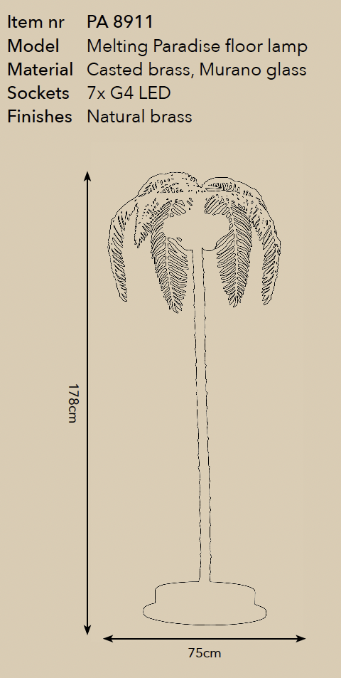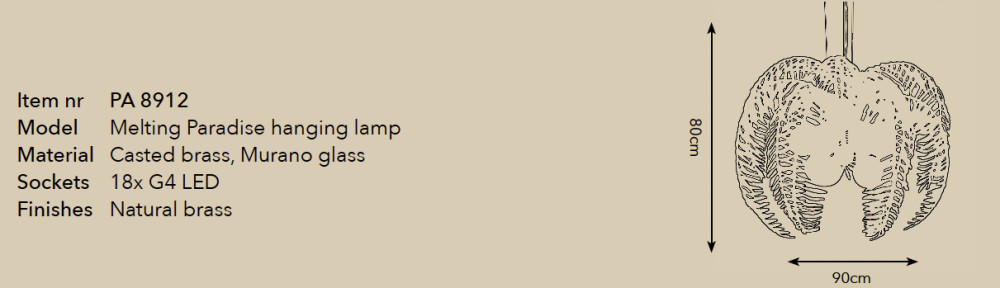 Melting Paradise -valaisimet valmistetaan valetusta messingistä ja viimeistellään Murano-lasilla, jossa kullan sävyt ja lasin elävä pinta heijastavat valoa pehmeästi ja lämpimästi. Messingin ja Murano-lasin yhdistelmä luo runsaan mutta tasapainoisen kokonaisuuden, joka korostaa valaisimen veistoksellista muotoa.