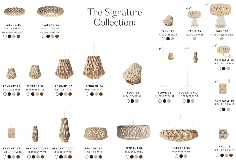 Kaikki Signature Collection -valaisimet valmistetaan FSC- tai PEFC-sertifioidusta suomalaisesta koivuvanerista. Valaisimet kootaan ilman liimaa tai ruuveja perinteistä suomalaista päretekniikkaa ja nykyaikaista tietokonemallinnusta yhdistäen. Lopputuloksena syntyy kevyt mutta kestävä rakenne, joka luo tilaan pehmeän ja eläviä varjoja tuottavan valaistuksen.