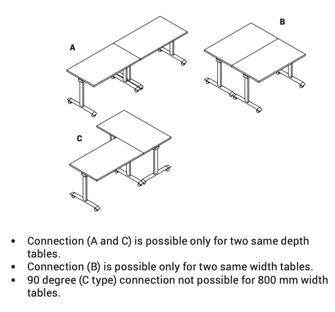 Lisävarusteena saatavana kiinnikkeet, joilla pystyy liittämään pöytä toisiinsa.