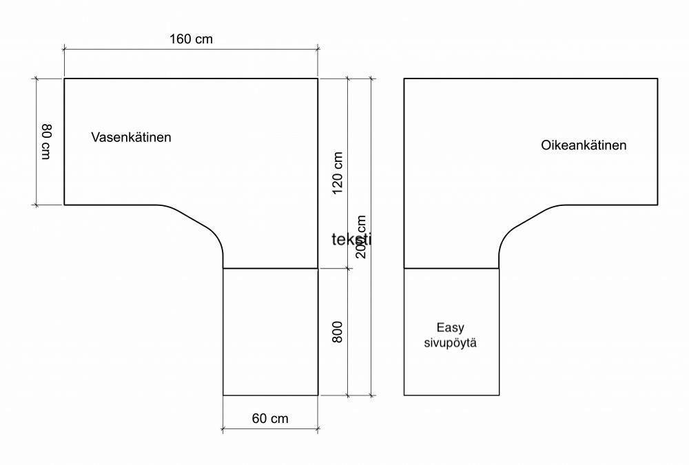 Kulmapöydän mitat: 160/80 x 120/60 cm