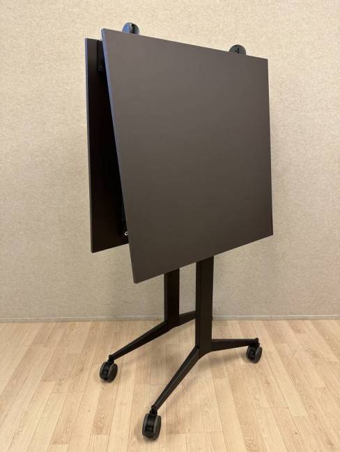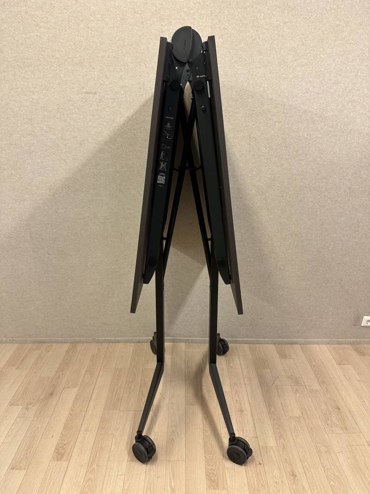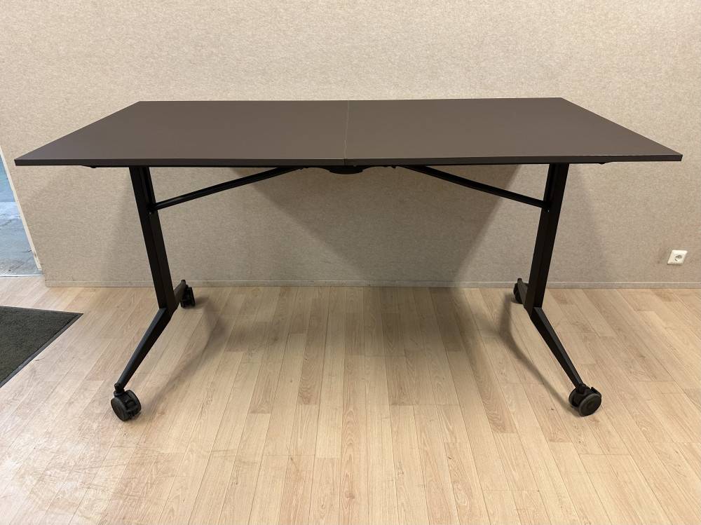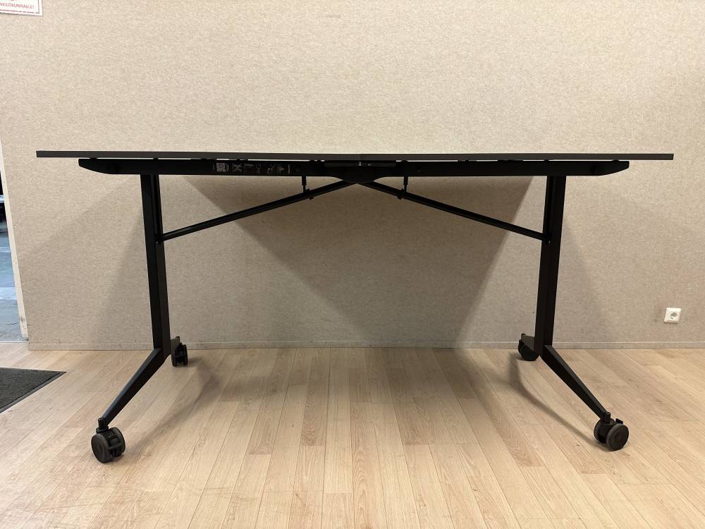 Kompaktimpi Mara-taittopöytä, jossa on mustat jalat pyörillä ja tummanruskea pöytälevy. Pöytä taittuu keskeltä kasaan, jolloin se vie vain vähän tilaa varastossa. Taitettuna korkeus on 189 cm ja syvyys 46 cm. Pyörien ansiosta pöytää on helppo liikutella, ja korkea 107 cm työskentelykorkeus sopii erinomaisesti esimerkiksi seisomakorkuisiin tiloihin ja tapahtumiin. Tämä on mallikappalepoisto, joten saat laadukkaan pöydän edullisesti.