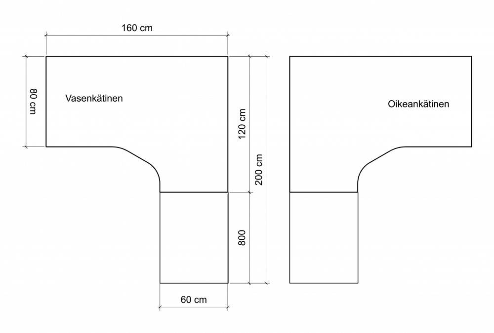 - kahden jalkavasteen pituus 70 cm, yhden jalkavasteen pituus 60 cm (joka 60 cm syvän pöytäkannen alla)