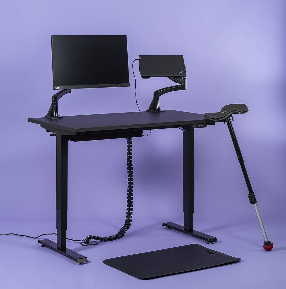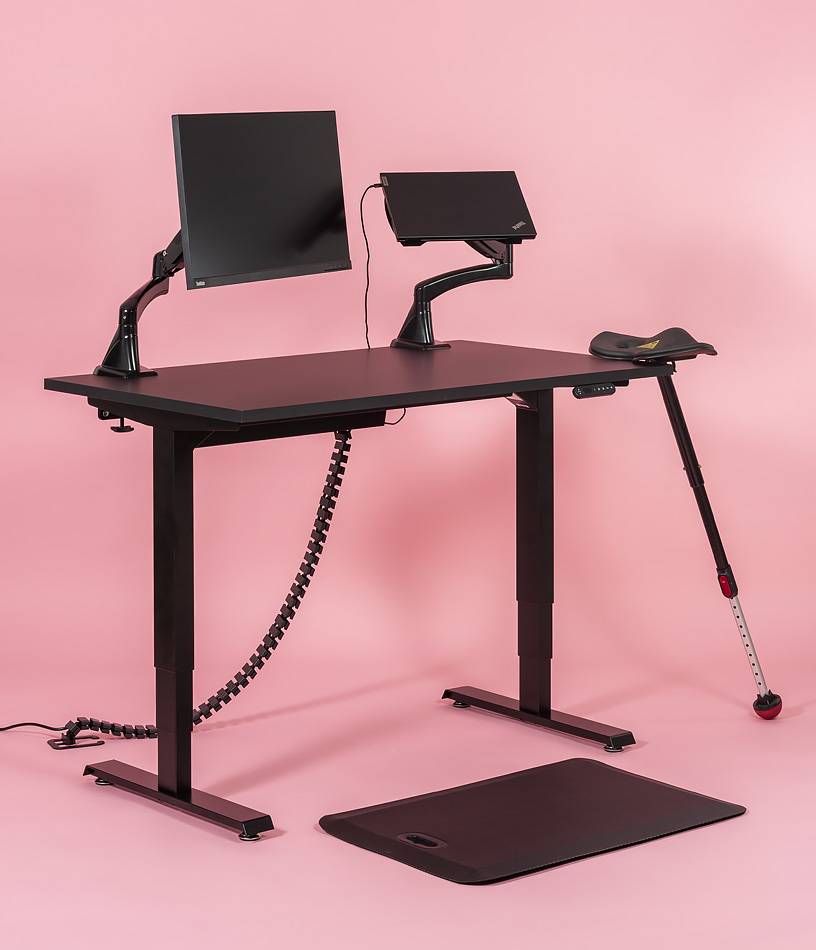 Mustat (RAL9005) sähköjalat, joissa molemmissa omat moottorit. Pöytälevy korkeapainelaminaattia, musta Fenix nanolaminaatti on sormenjälkiä hylkivä. ABS reunalista kannen sävyyn, pöytälevyn paksuus 25 mm. Pöytälevyä on saatavissa myös pyöristetyillä kulmilla.