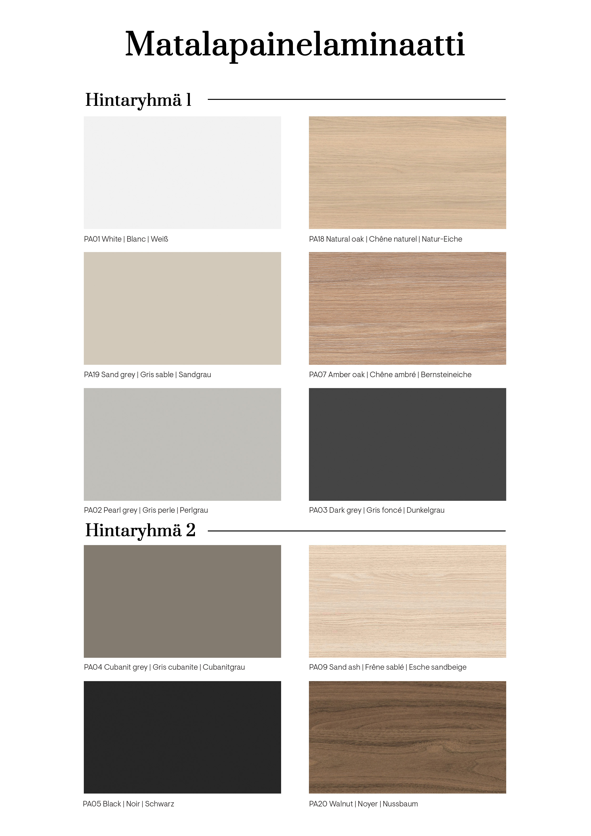 Pöytälevy on matalapainelaminaattia, joka on helppohoitoinen ja soveltuu julkitilakäyttöön. Runko on saatavana väreissä valkoinen (RAL9016), harmaa (RAL7045) ja musta (RAL9005).