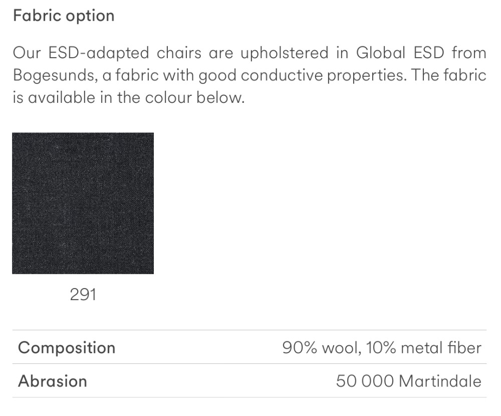 MALMSTOLEN 4006H työtuoli on rakennettu 4000 HIGH työtuolin pohjalta, joten tuolin ergonomiset ominaisuudet säilyvät, mutta tuolit varustellaan ESD-ympäristöön tarpeellisilla varusteilla, kuten sinkityillä pyörillä ja Global ESD-verhoilulla. Global ESD on laadukas antistaattinen kangas, jonka ainutlaatuiset kuidut johtavat sähköä - siksi se on hyvä valinta alttiisiin dataympäristöihin. Global ESD kangas sisältää 90 % villaa ja 10 % metallisia kuituja, hankauskesto 50 000 Martindalea.