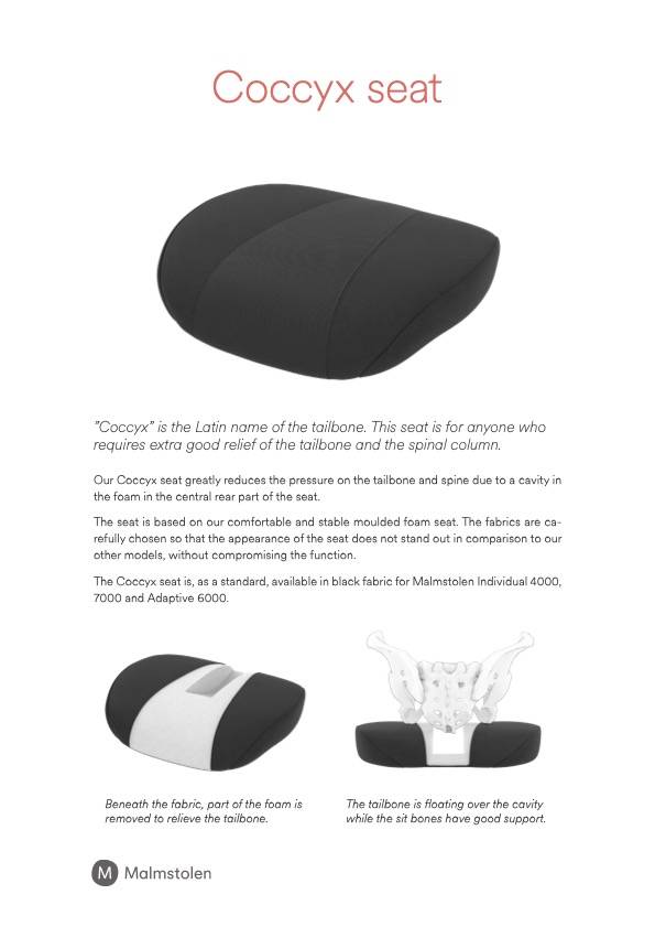 Coccyx-erikoistuin on lisävaruste Malmstolen Individual 4000 ja 7000 työtuoleihin. Coccyx-istuin on tarkoitettu häntäluun murtuman tai muun vastaavan istumista hankaloittavan vaivan omaaville. Istuimen keskeltä takaosasta on poistettu pehmusteet. Takaosa on verhoiltu joustavalla verkolla, joka takaa paineettoman istuintuntuman tälle herkälle alueelle. Istuin näyttää päällepäin täysin normaalilta tuolin istuimelta, eikä herätä huomiota tai erotu joukosta.