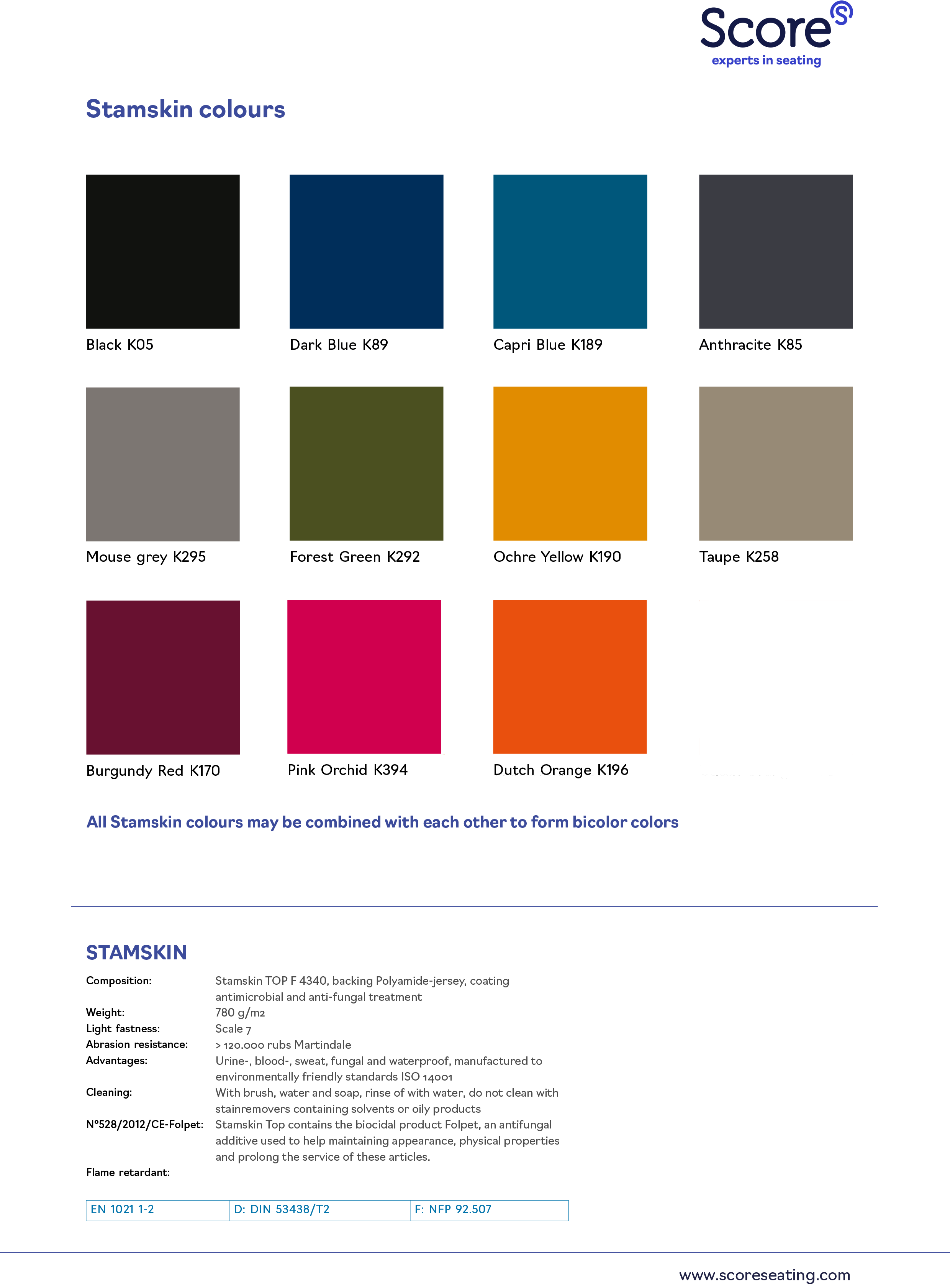 Saumaton verhoilu estää lian ja pölyn kerääntymisen saumoihin. Verhoiluvaihtoehtoja on kaksi, molemmat verhoiluvaihtoehdot ovat antibakteerisia. PUxx on korkealaatuinen ja joustava PU-nahka. Toisin kuin useimmat verhoilut, PUxx keinonahalla verhoillut istuimet kestävät klooripohjaisia puhdistus- ja desinfiointiaineita, 70 % alkoholia ja vetyperoksidia. Stamskin kestävä ja hengittävä keinonahka, joka kestää verta, virtsaa, hikeä, hometta ja vettä.