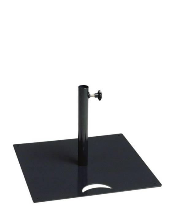 Neliönmallinen aurinkovarjon jalka, 60x60 cm. 10 mm terästä, hiekkapuhallettu metalloitu ja pulverimaalattu. Saatavana mustana (RAL 9005) tai valkoisena (RAL 9010). Paino 30 kg.