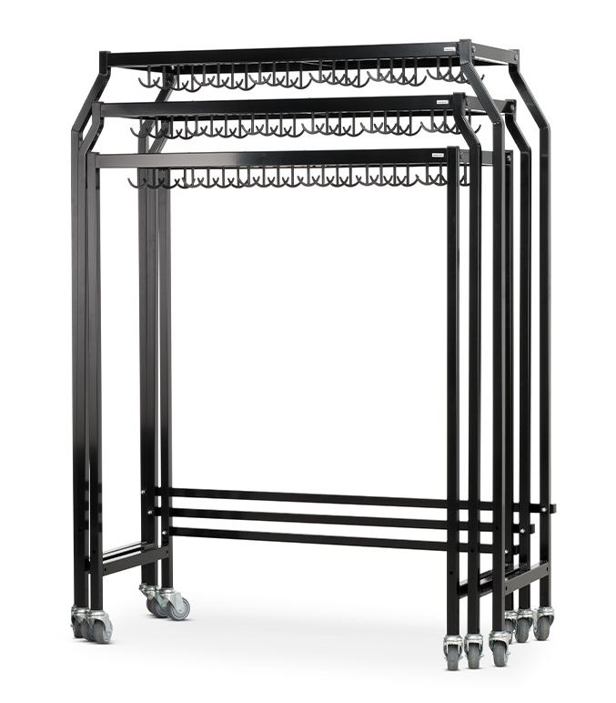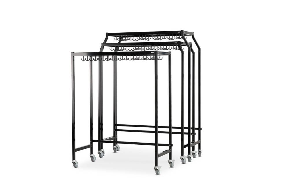 Naulakot ovat säilytettävissä sisäkkäin, mikä helpottaa säilytystä käytön ulkopuolella. Suuret pyörät mahdollistavat helpon siirtämisen tilasta toiseen.