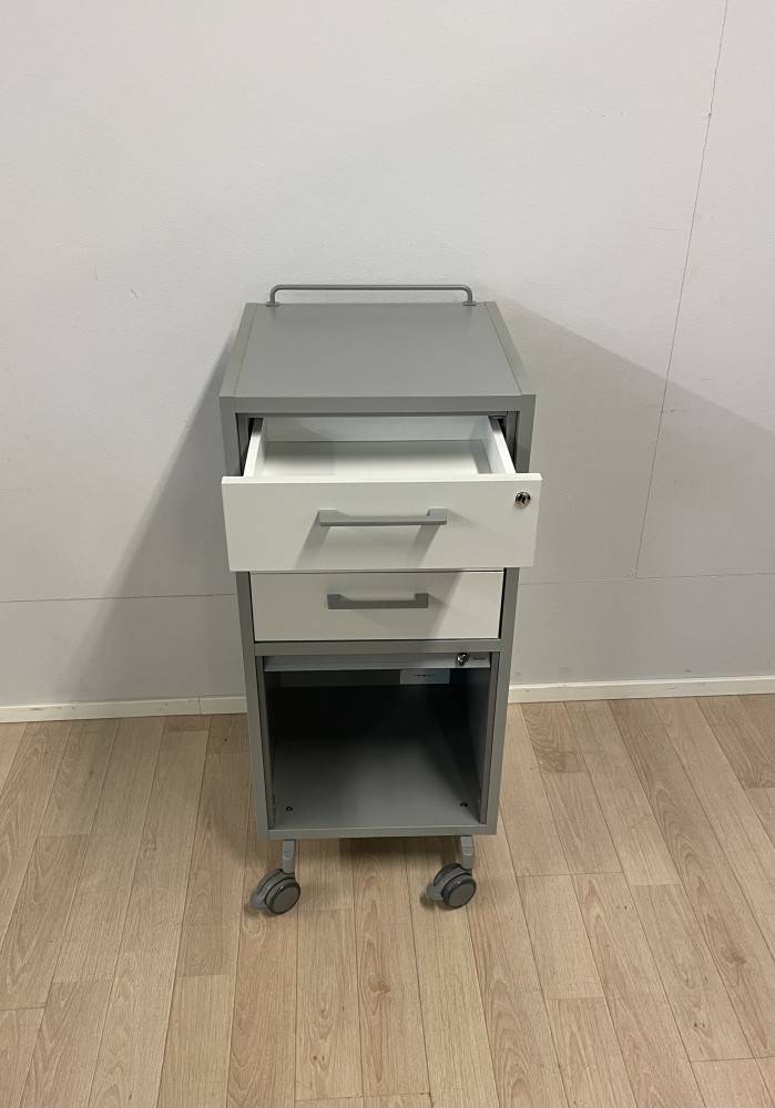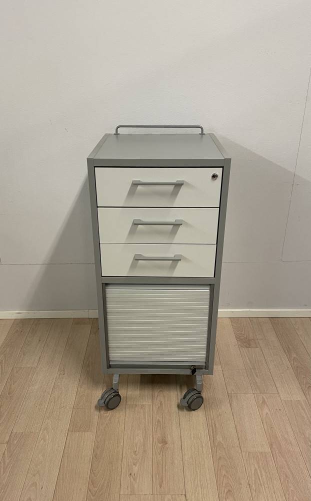 Yläosassa 3 laatikkoa ja alhaalla rulokaappi.