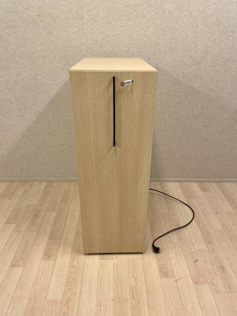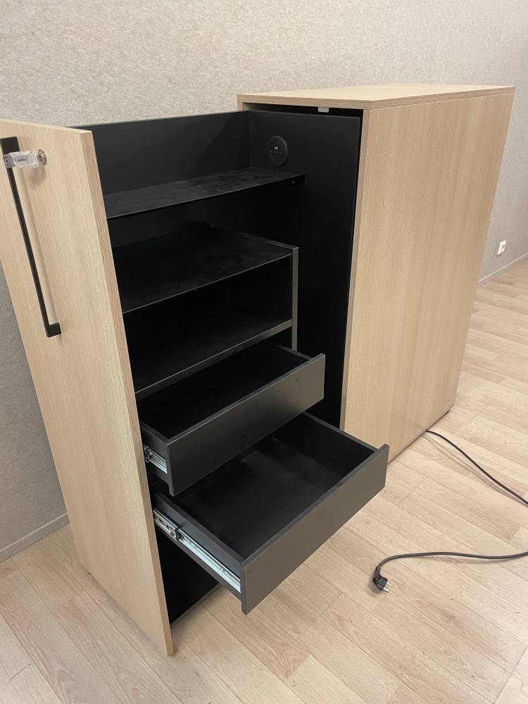 Kaapissa on yksi hylly ja kaksi pientä laatikkoa sekä pistoke. Kaappi on lukittava ja mukana tulee 2 avainta. Kaapin kuormitus on max 50 kg.