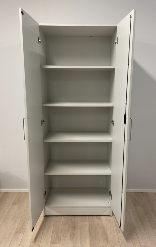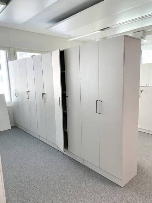 Hyvä käytetty kunto – ovet toimivat ja hyllyt ehjät, normaalia toimistokäytön jälkeä.