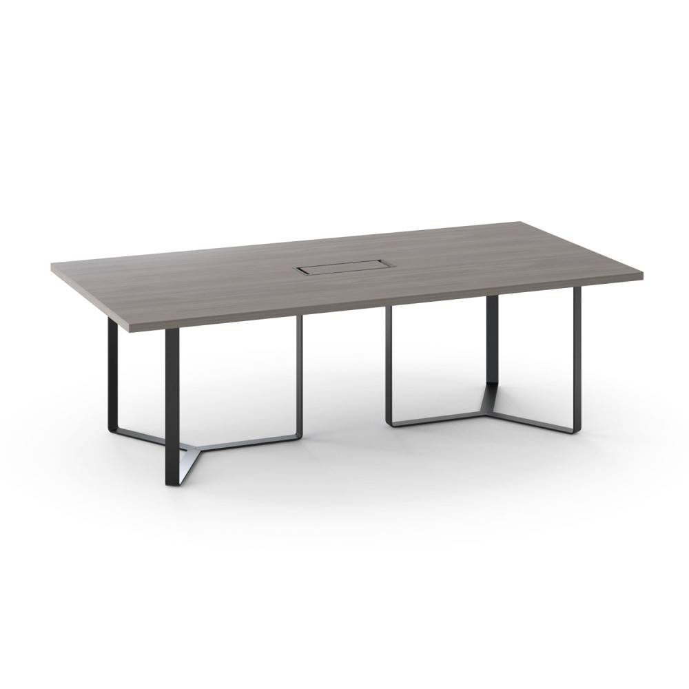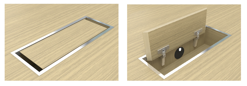 PLANA neuvottelupöydässä on pehmeästi sulkeutuva johtoluukku, jossa on metallirunko ja jonka keskiosa on samaa materiaalia mitä pöydän kansikin. Alla johtokouru. Pidemmässä pöydässä on kaksi johtoluukkua. (Sähköpistokkeet eivät sisälly hintaan, lisää ostoskoriin kohdasta "Lisätarvikkeet")