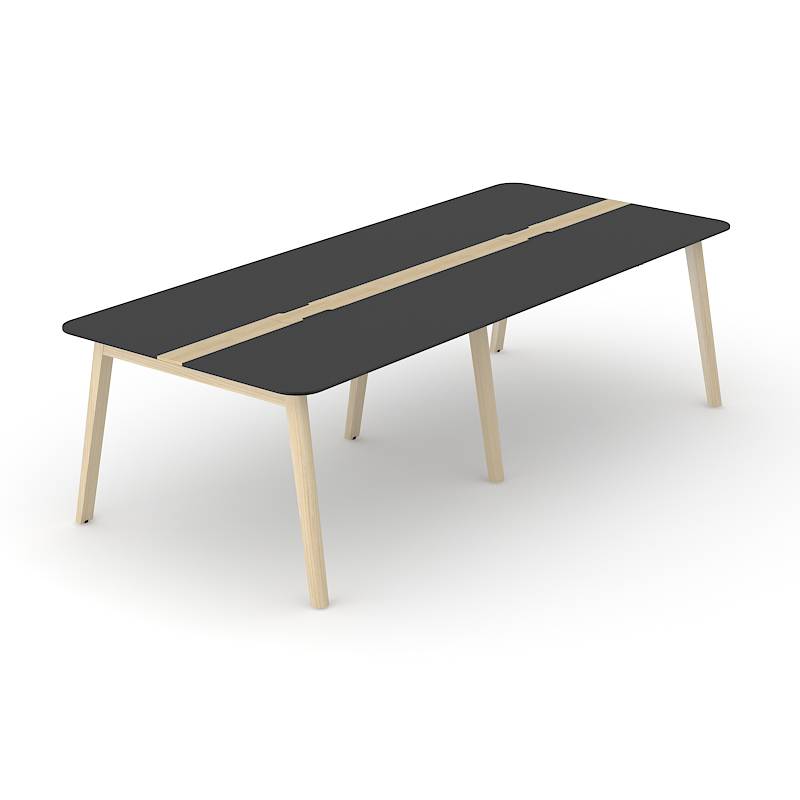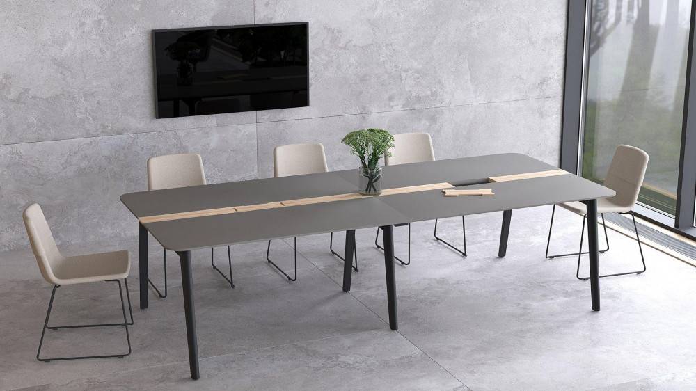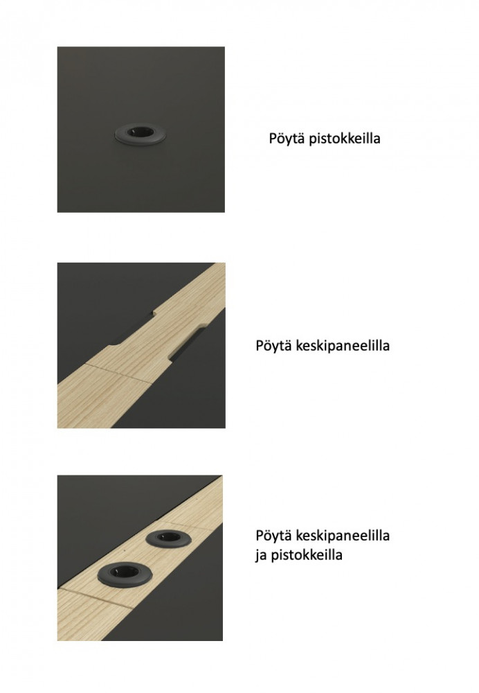 - pöydän keskellä saarnin värinen paneeli, jossa pistokkeet ja pöydän alla johtokouru