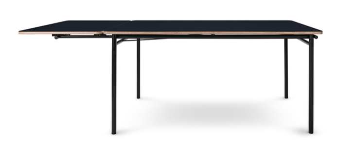 Pöydässä on vanerinen pöytätaso, joka on päällystetty orgaanisella linoleumilla. Pöydässä on integroidut jatkopalat, jotka on helppo vetää ulos, kun tarvitaan lisää tilaa.