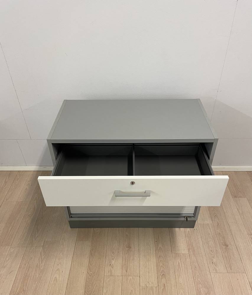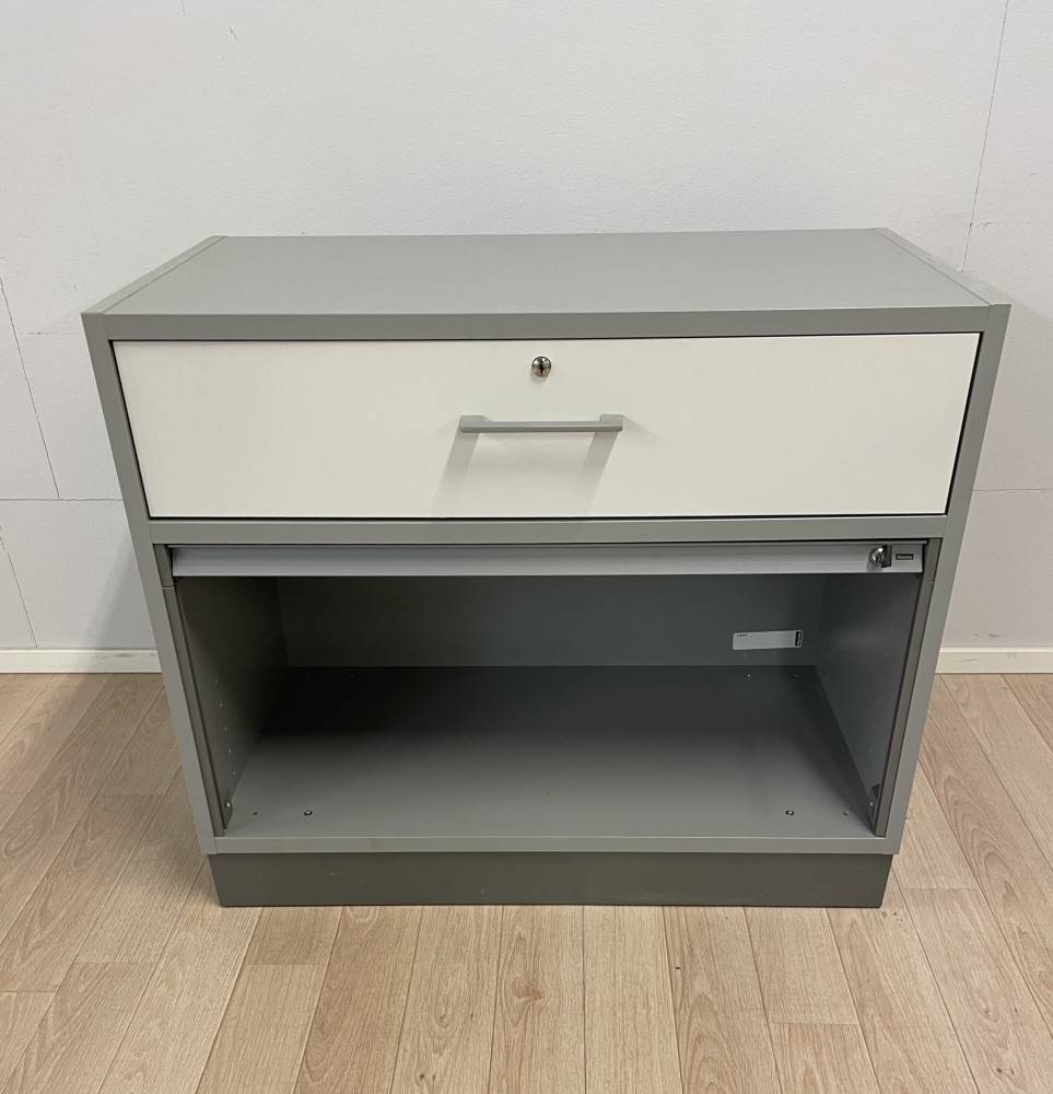 Siisti Martelan kaappi. Vaaleanharmaa runko ja valkoinen laatikko sekä rulo-ovi.