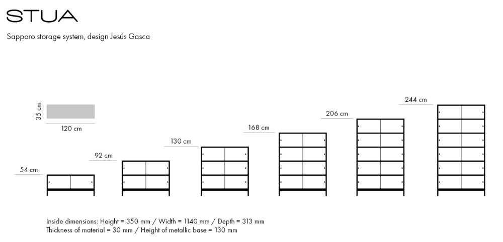 Sapporo säilytyskalustejärjestelmä on monipuolinen ja hienostunut. Moduuleita voidaan pinota päällekkäin ja jokaisessa moduulissa voi olla liukuovet tai sitä voidaan käyttää avohyllynä. Sapporoa voi käytää yksittäisenä hyllyelementtinä tai pinota jopa kuuden hyllyn korkeudelle. Moduulit lepäävät valkoisella teräsjalustalla tai niihin voidaan asentaa valkoiset pyörät. Pyörien kanssa pinottavuus on vain 2 moduulia. Vakioleveys on 120 cm. Liukuovet voivat olla lasia tai viilupintaisia. Ovet voidaan lisätä tai poistaa rakennetta muuttamatta. Sapporo moduulit on aina viimeistelty valkoisella lakalla, kuten Sapporon lumi japanissa.