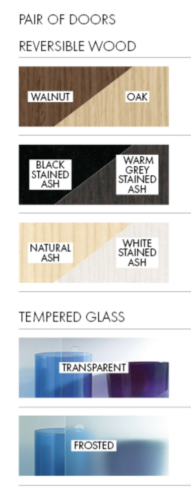Liukuovien värivaihtoehdot: tammiviilu, pähkinäviilu, mustaksi petsattu saarni, lämpimän harmaaksi petsattu saarni, luonnonvärinen saarni, valkoiseksi petsattu saarni, läpinäkyvä tai huurrettu karkaistu lasi.