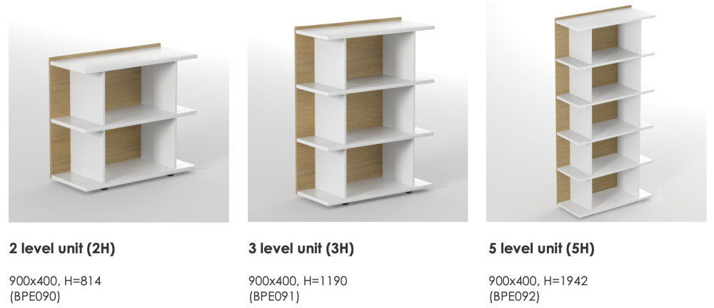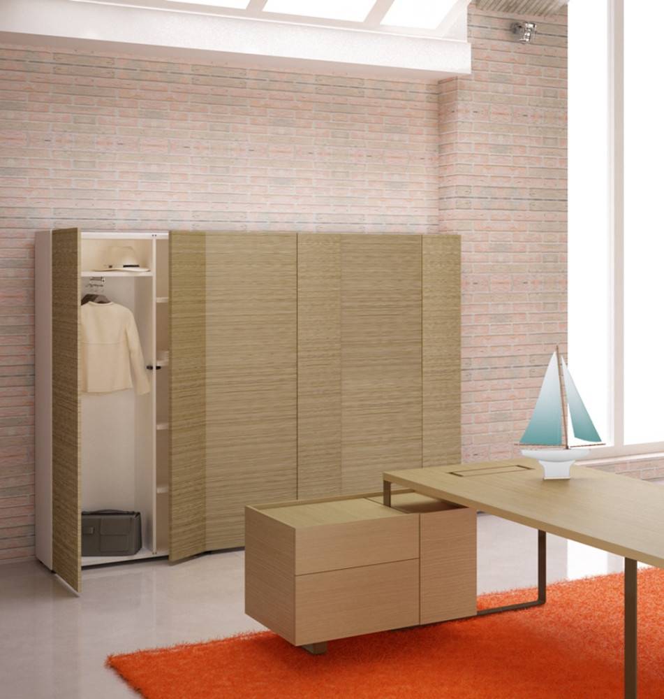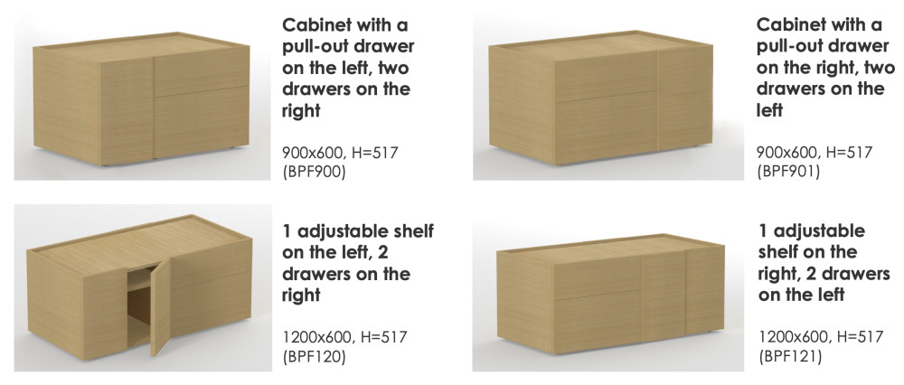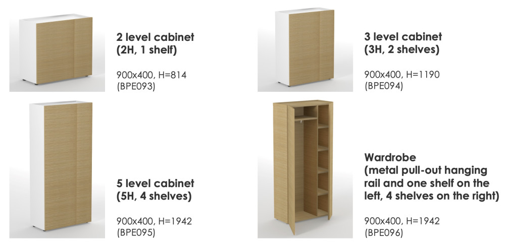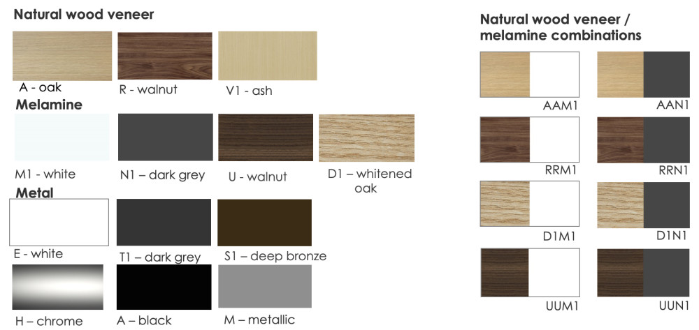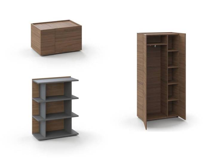 Sarja sisältää monenlaisia säilytysratkaisuja, kuten kaappeja vetolaatikoilla tai aukeavilla ovilla, avohyllyjä sekä vaatekaapin. Ylin vetolaatikko on verhoiltu sisäpuolelta aidolla nahalla.