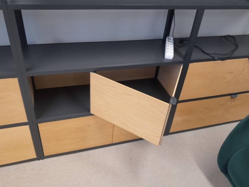 Avohyllyjen ja ovellisten säilytysosien yhdistelmä tekee kokonaisuudesta käytännöllisen – saat sekä esillepintaa että piilotettua säilytystilaa. Modulaarinen rakenne mahdollistaa muokkaamisen eri tarpeisiin.
