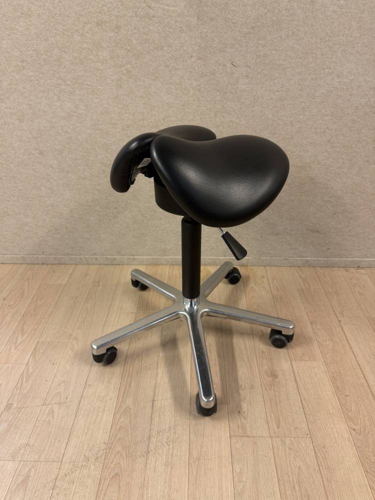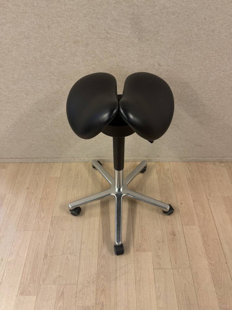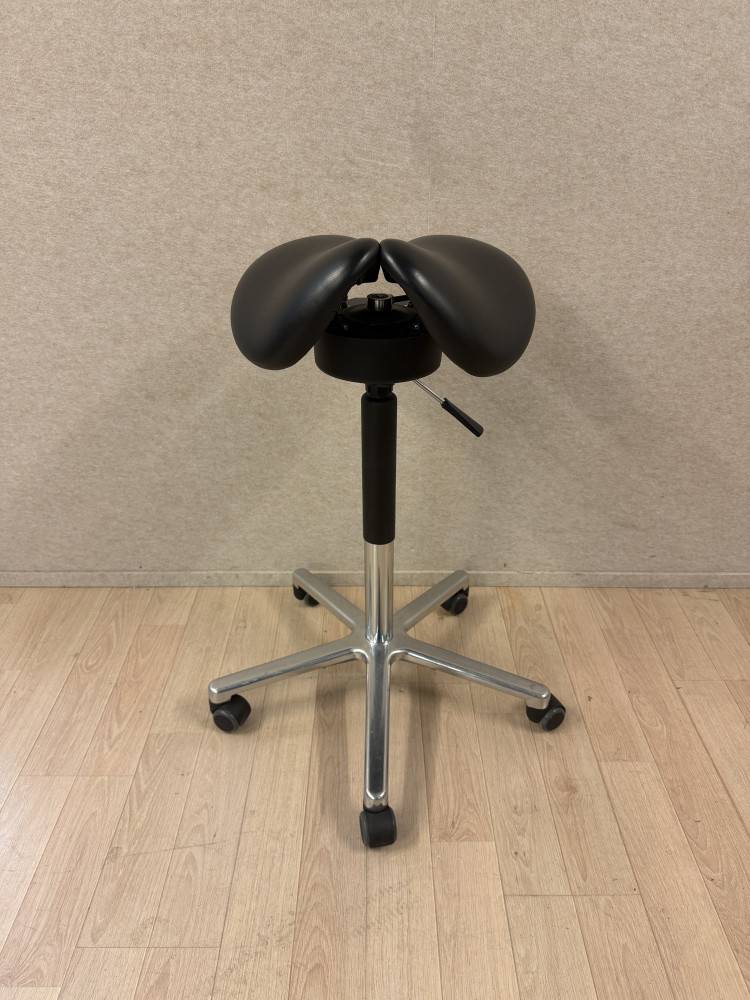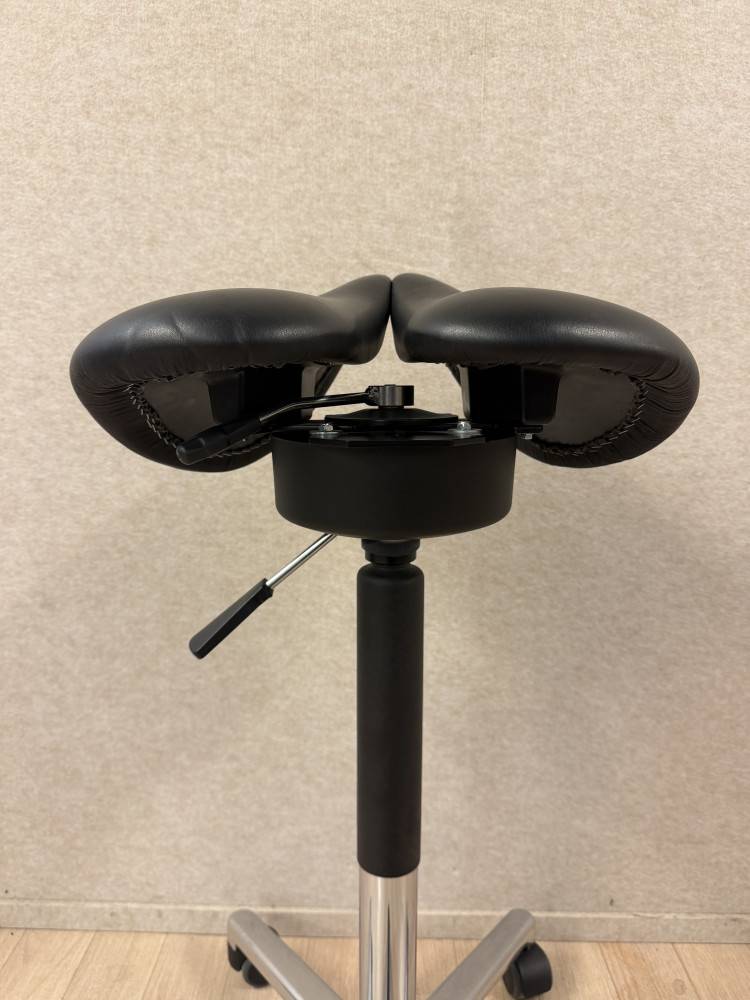 Myymälän mallikappaleena ollut kaksiosainen keinuva satulatuoli ergonomiseen työskentelyyn. Kaksiosainen istuin vähentää painetta ja auttaa löytämään luonnollisemman istuma-asennon. Keinuva istuinosa aktivoi kehoa kevyesti ja tekee pitkästäkin työskentelystä mukavampaa.