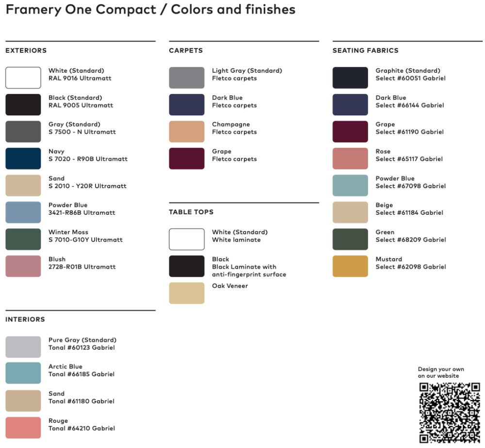 Framery One Compact on saatavilla kokoonpanoina Base ja Essentials, jotka eroavat varustelun ja viimeistelyn osalta. Sisätilan varustelu määräytyy valitun mallin mukaan ja voi sisältää esimerkiksi korkeussäädettävän istuimen sekä erilaisia pöytä- ja pintavaihtoehtoja.