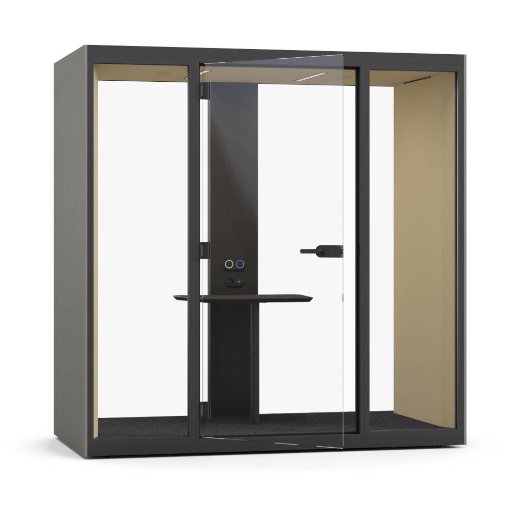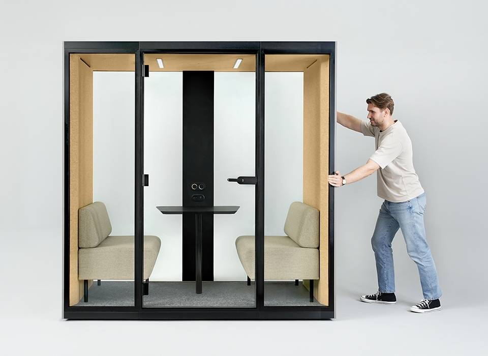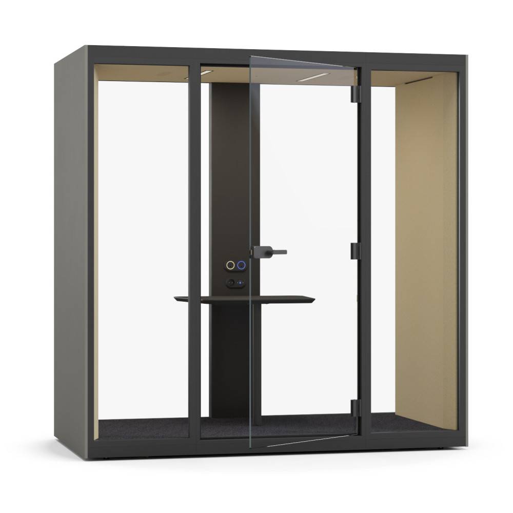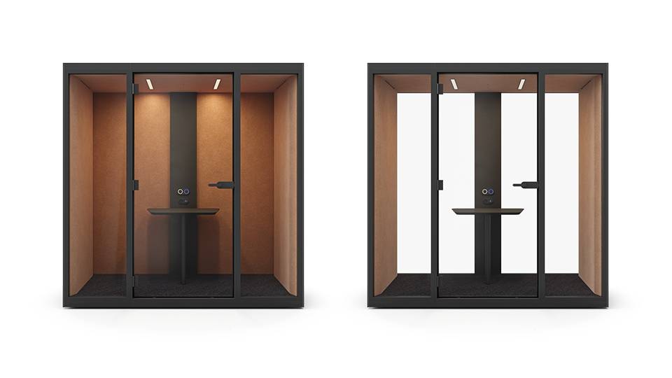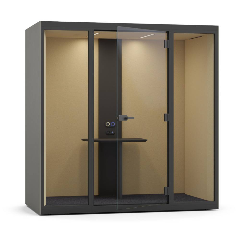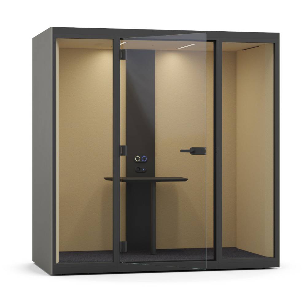Tilava sisätila ja kahden istuttava verhoiltu istuin mahdollistavat mukavan työskentelyn ja keskustelun myös pidemmissä tapaamisissa. Integroitu työskentelytaso ja virtapiste tukevat kannettavien laitteiden käyttöä. Automaattinen ilmanvaihto ja valaistus varmistavat tasaiset olosuhteet, ja niitä voidaan säätää tarpeen mukaan.