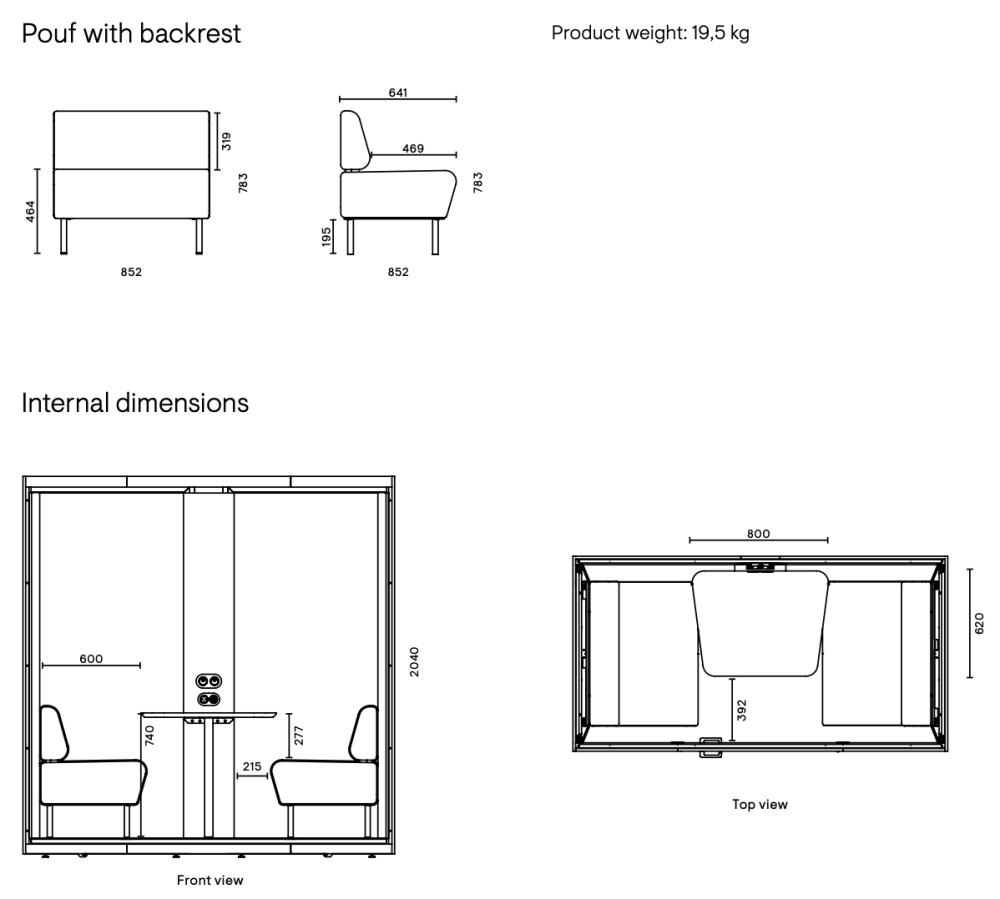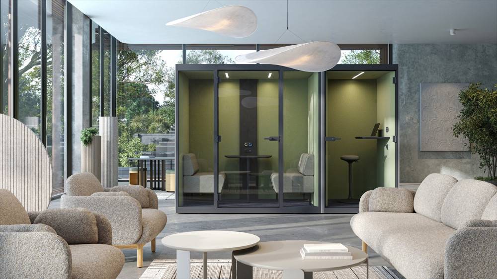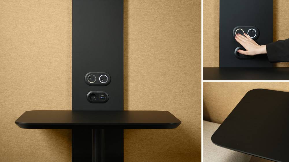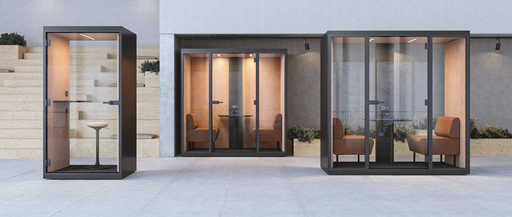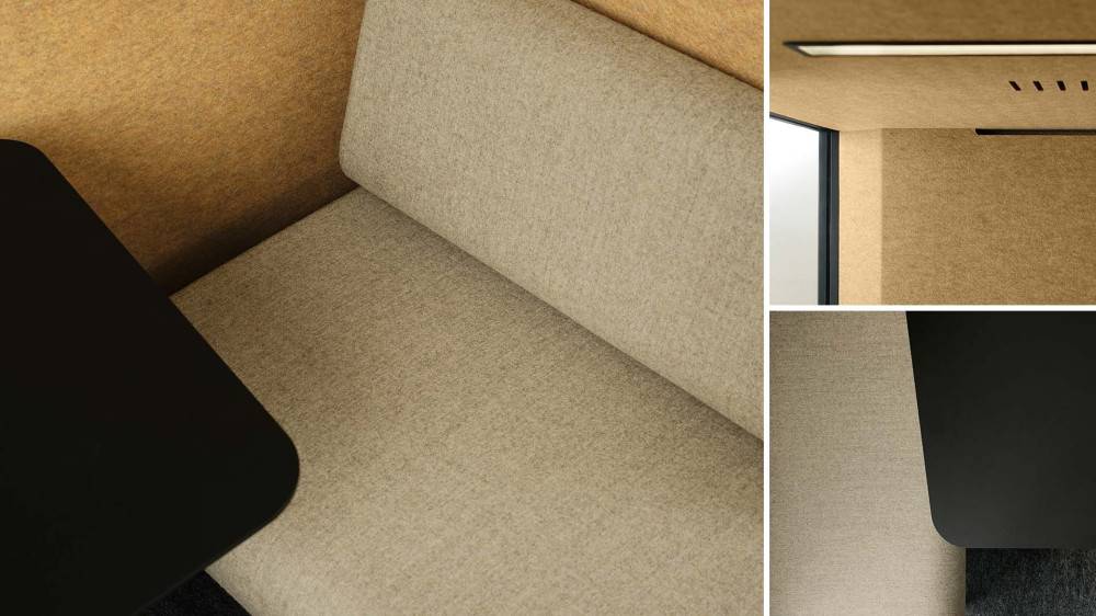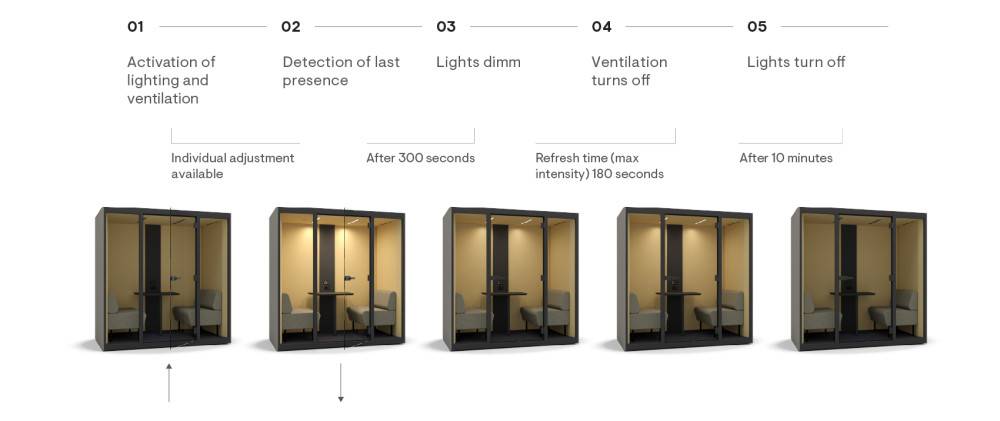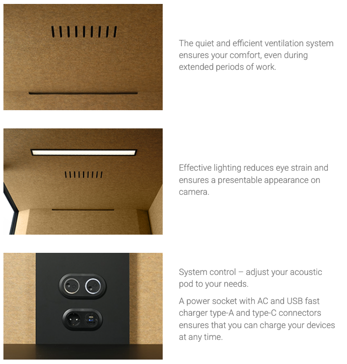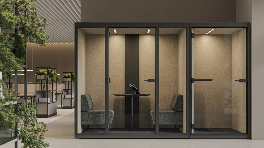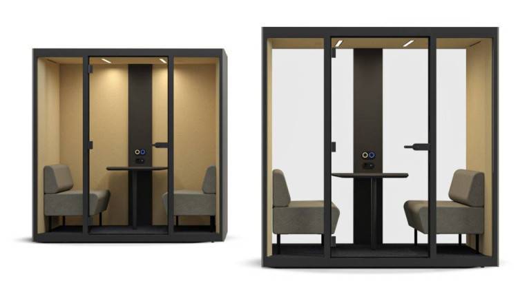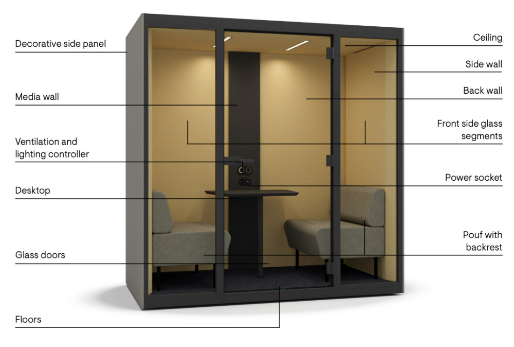 Tilava sisätila ja kahden istuttava verhoiltu istuin mahdollistavat mukavan työskentelyn ja keskustelun myös pidemmissä tapaamisissa. Integroitu työskentelytaso ja virtapiste tukevat kannettavien laitteiden käyttöä. Automaattinen ilmanvaihto ja valaistus varmistavat tasaiset olosuhteet, ja niitä voidaan säätää tarpeen mukaan.
