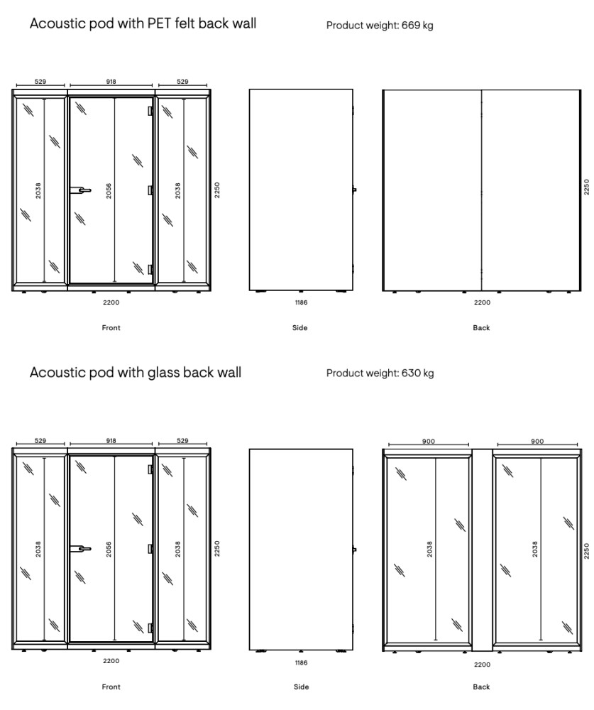 Takaseinä on valittavissa lasisena tai PET-huopaisena. Lasitaustainen versio lisää tilan läpinäkyvyyttä ja valon kulkua, kun taas PET-huopainen vaihtoehto soveltuu seinää vasten sijoitettavaksi. Molemmat vaihtoehdot täyttävät akustisen luokan B vaatimukset standardin ISO 23351-1 mukaisesti.