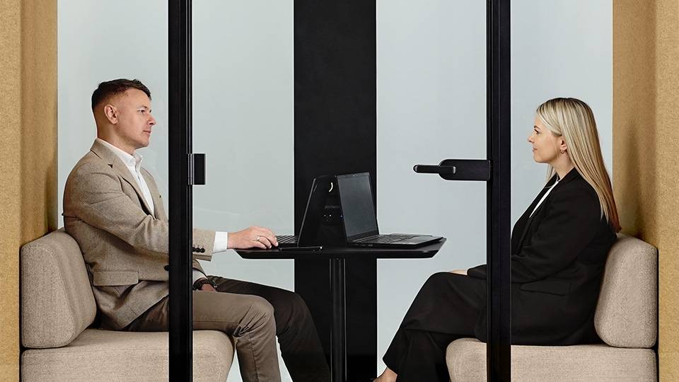 NARBUTAS SONUS M on kahdelle henkilölle suunniteltu akustinen työtila rauhallisiin keskusteluihin, etäpalavereihin ja pieniin tapaamisiin. Se soveltuu toimistoihin, neuvottelualueille ja avotiloihin, joissa tarvitaan suljettu tila luottamuksellisille kohtaamisille.